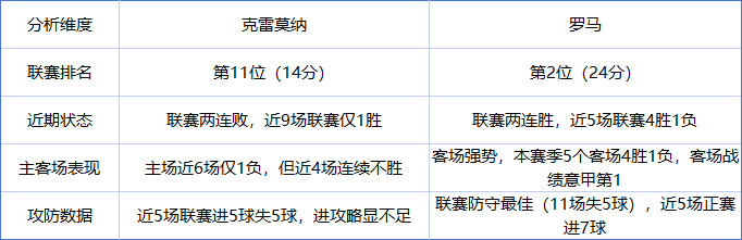 การแข่งขันในศึกเซเรียอาครั้งนี้เป็นการปะทะกันระหว่างทีมชั้นนำกับทีมรองบ่อนตามคาด แต่จากการพบกันในอดีตชี้ให้เห็นว่า เครโมเนเซ่ มีความได้เปรียบในบ้านอย่างชัดเจน โรม่ามีความเหนือกว่าในแง่ของคุณภาพโดยรวมและฟอร์มการเล่นในปัจจุบัน แต่การเก็บสามแต้มอย่างสบายๆ จะไม่ใช่เรื่องง่าย