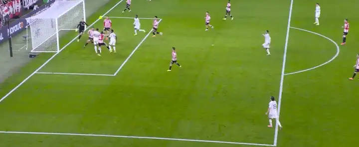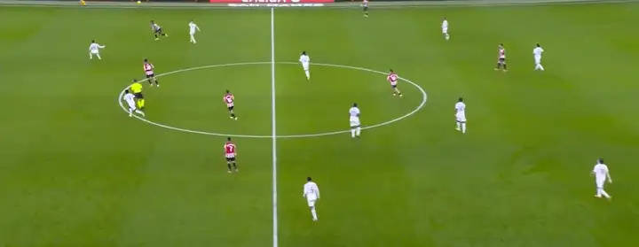 เขาพยายามบุกทะลุผ่านกลางสนามในตอนแรก แต่ฝ่ายตรงข้ามปิดกั้นเขาไว้ ทำให้เขาไม่สามารถก้าวหน้าได้ ด้วยเหตุนี้ เขาจึงเริ่มวนรอบไปมา เมื่อเขาไปถึงบริเวณที่เหมาะสม เขาส่งบอลให้กับเพื่อนร่วมทีมของเขา เบลลิงแฮม