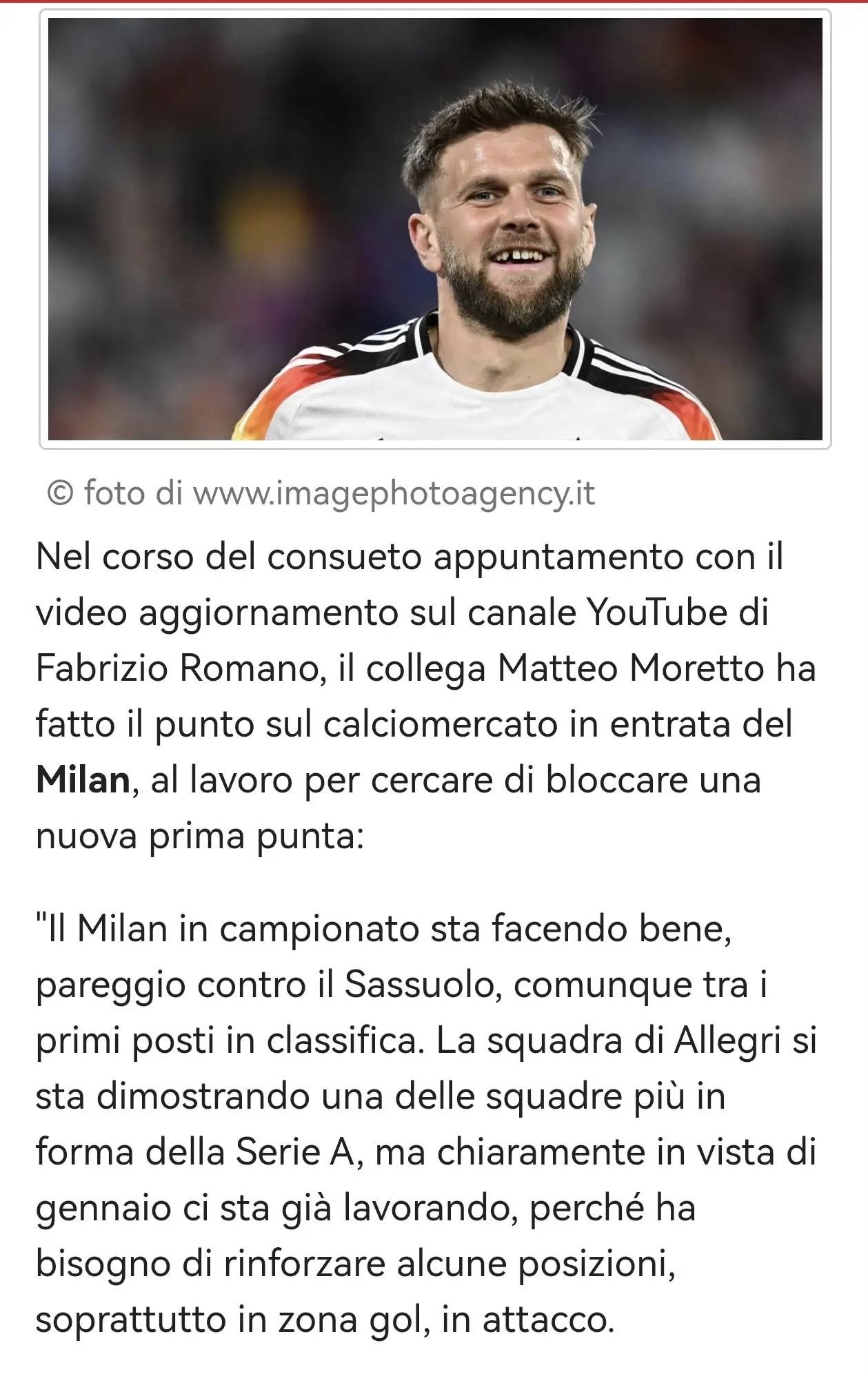 ในวิดีโออัปเดตการย้ายทีมของ Fabrizio Romano บนช่อง YouTube เพื่อนร่วมงาน Matteo Moretto ได้สรุปความคืบหน้าในการสรรหานักเตะของ AC Milan โดยสโมสรกำลังพยายามอย่างเต็มที่เพื่อคว้าตัวกองหน้าตัวใหม่ของทีมชุดใหญ่: