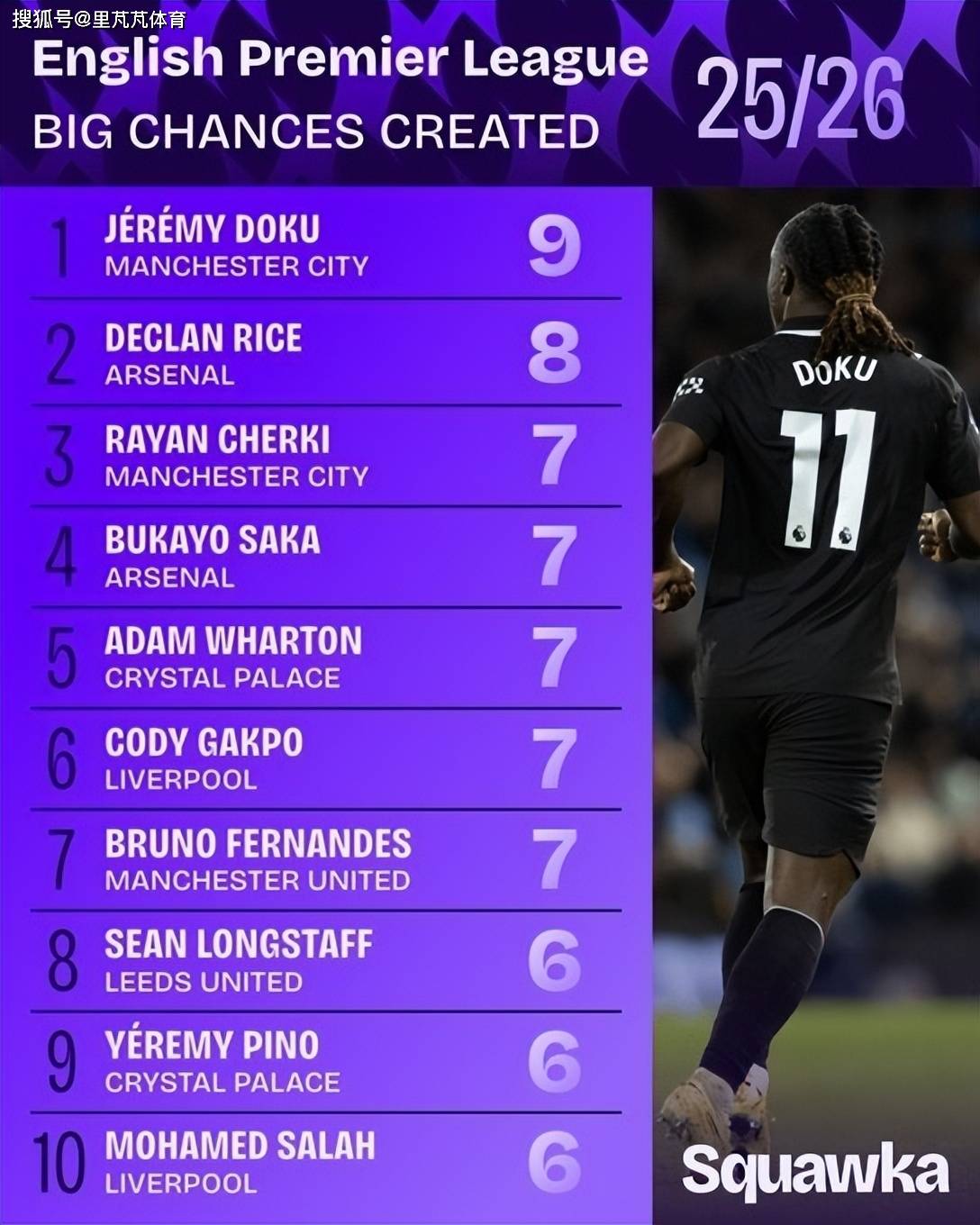 หน่วยงานข้อมูล Squawka ได้รวบรวมอันดับพรีเมียร์ลีกฤดูกาลนี้ทั้งในด้านการสร้างโอกาสสำคัญโดยรวมและสร้างโอกาสสำคัญจากการเล่นแบบเปิด โดย Doku ครองอันดับสูงสุดในทั้งสองตาราง