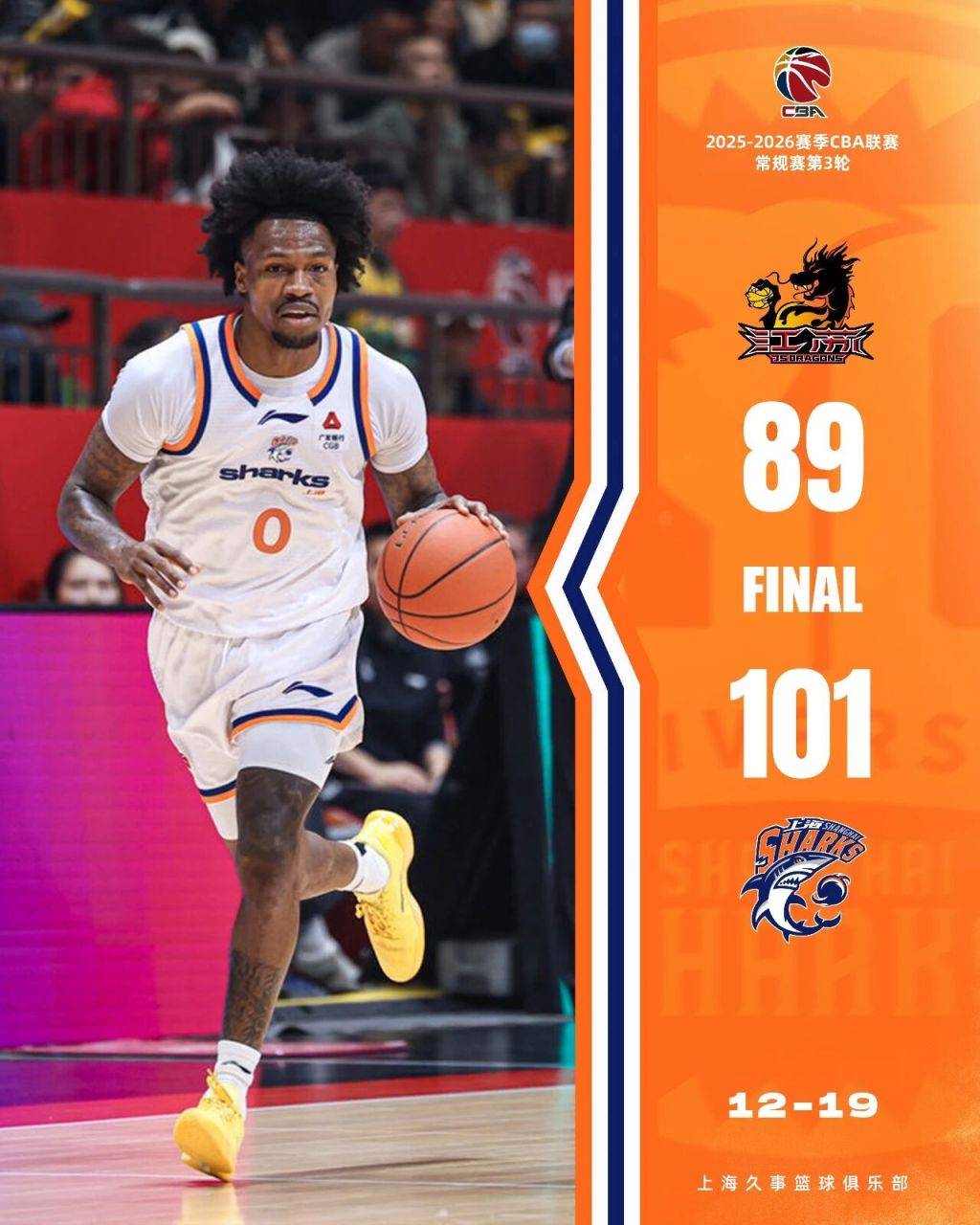 เมื่อวันที่ 19 ธันวาคม เวลาปักกิ่ง ในรอบที่สามของฤดูกาลปกติ CBA ทีมเซี่ยงไฮ้ชาร์คส์สามารถคว้าชัยชนะนอกบ้านด้วยคะแนน 101-89 เหนือทีมเจียงซูเคนจิยาไลออนส์ ซึ่งพ่ายแพ้ในลีกเป็นนัดที่สามติดต่อกัน ในอีกนัดหนึ่ง ทีมกวางตุ้งตงเยว่ไลออนส์เอาชนะทีมกวางโจวหลางไถไฮบินไลออนส์ในบ้านด้วยคะแนน 97-94 ทำให้พวกเขาชนะติดต่อกันเป็นนัดที่สาม