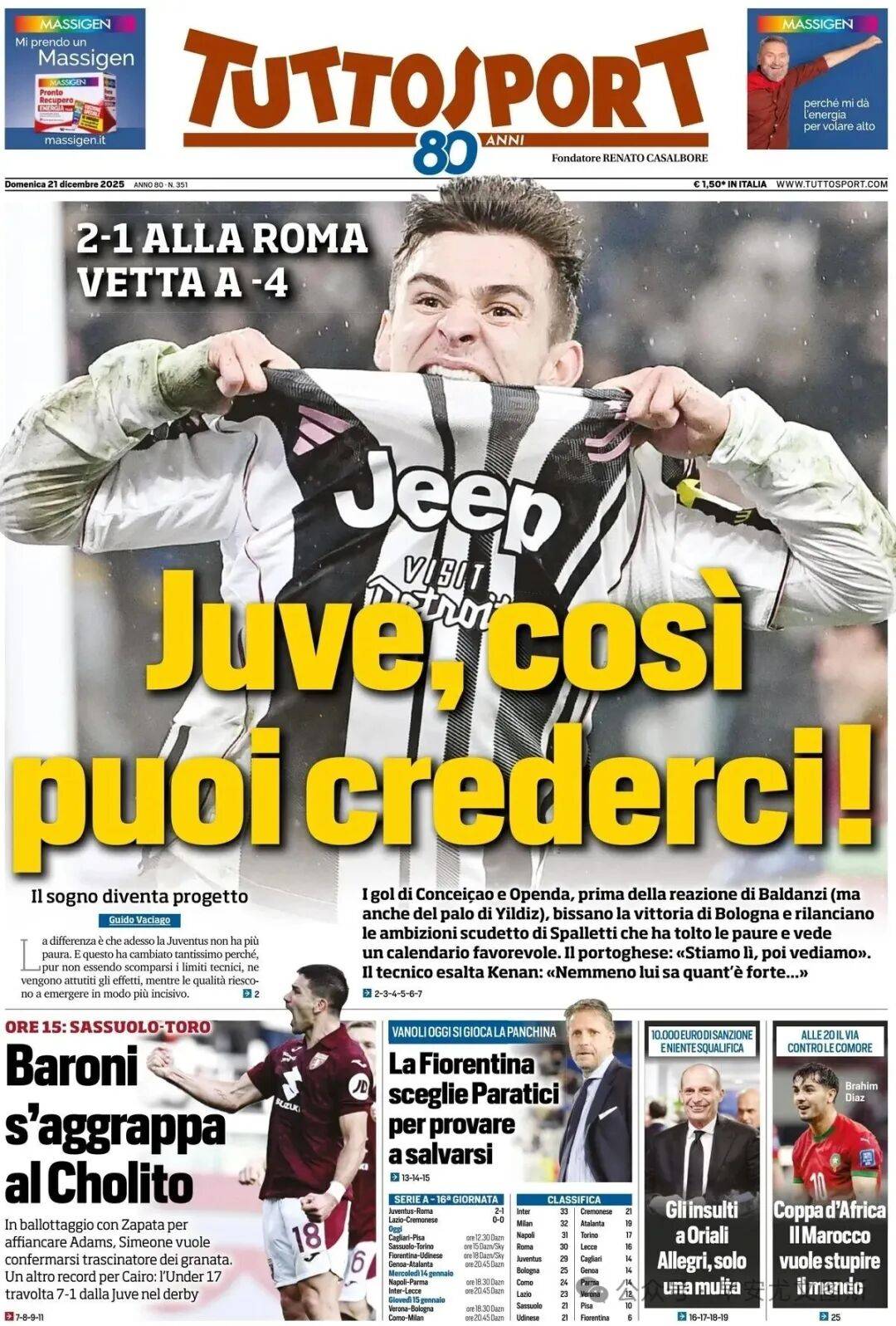 1. ยูเวนตุส, คุณสามารถเชื่อได้: ชัยชนะ 2-1 เหนือโรม่าทำให้พวกเขาตามหลังจ่าฝูงเพียงสี่แต้มเท่านั้นคอนเซเซาและโอเปนดาทำประตูได้ โดยบัลดานซีตอบโต้กลับ อิลดิซยิงชนเสา หลังจากชัยชนะเหนือโบโลญญาความหวังในการคว้าแชมป์เซเรียอาของสปัลเล็ตติได้กลับมาอีกครั้ง เขาได้ขจัดความกังวลของทีมออกไป และตอนนี้ต้องเผชิญกับโปรแกรมการแข่งขันที่เอื้ออำนวยผู้จัดการทีมยกย่องเคียนว่า "เขาไม่รู้ด้วยซ้ำว่าตัวเองแข็งแกร่งแค่ไหน"