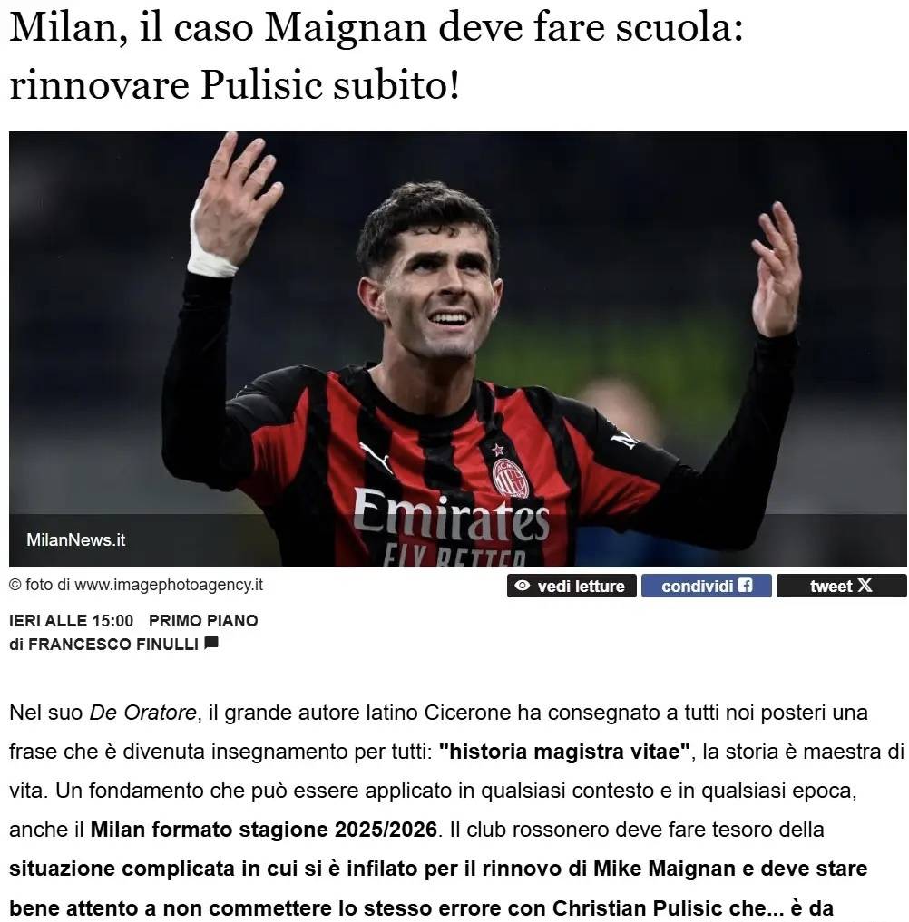 พูลิซิช! มิลานต้องเรียนรู้จากประสบการณ์การต่อสัญญาของไมญ็อง และไม่ควรรอจนกว่าพูลิซิชจะเข้าสู่ปีสุดท้ายของสัญญาเพื่อเริ่มการเจรจาต่อสัญญา ภารกิจหลักของมิลานในตอนนี้คือการทำให้แน่ใจว่าพูลิซิชจะต่อสัญญาเพื่อรักษาผู้เล่นคนสำคัญนี้ไว้ระยะยาว