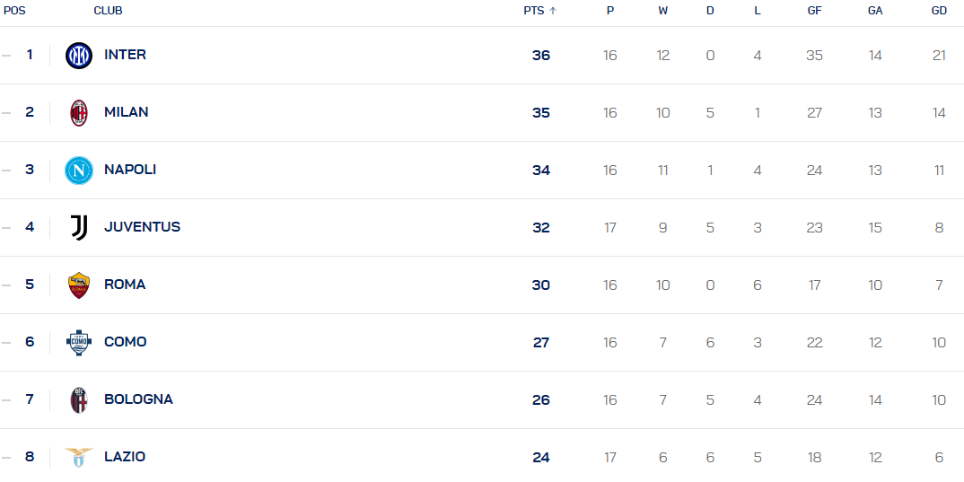 เมื่อวันที่ 29 ธันวาคม เวลาปักกิ่ง การแข่งขันเซเรีย อา นัดที่ 17 ได้สิ้นสุดลงแล้ว ยกเว้นการแข่งขันระหว่าง โรม่า กับ เจนัว อันดับตารางลีกปัจจุบันมีดังนี้: