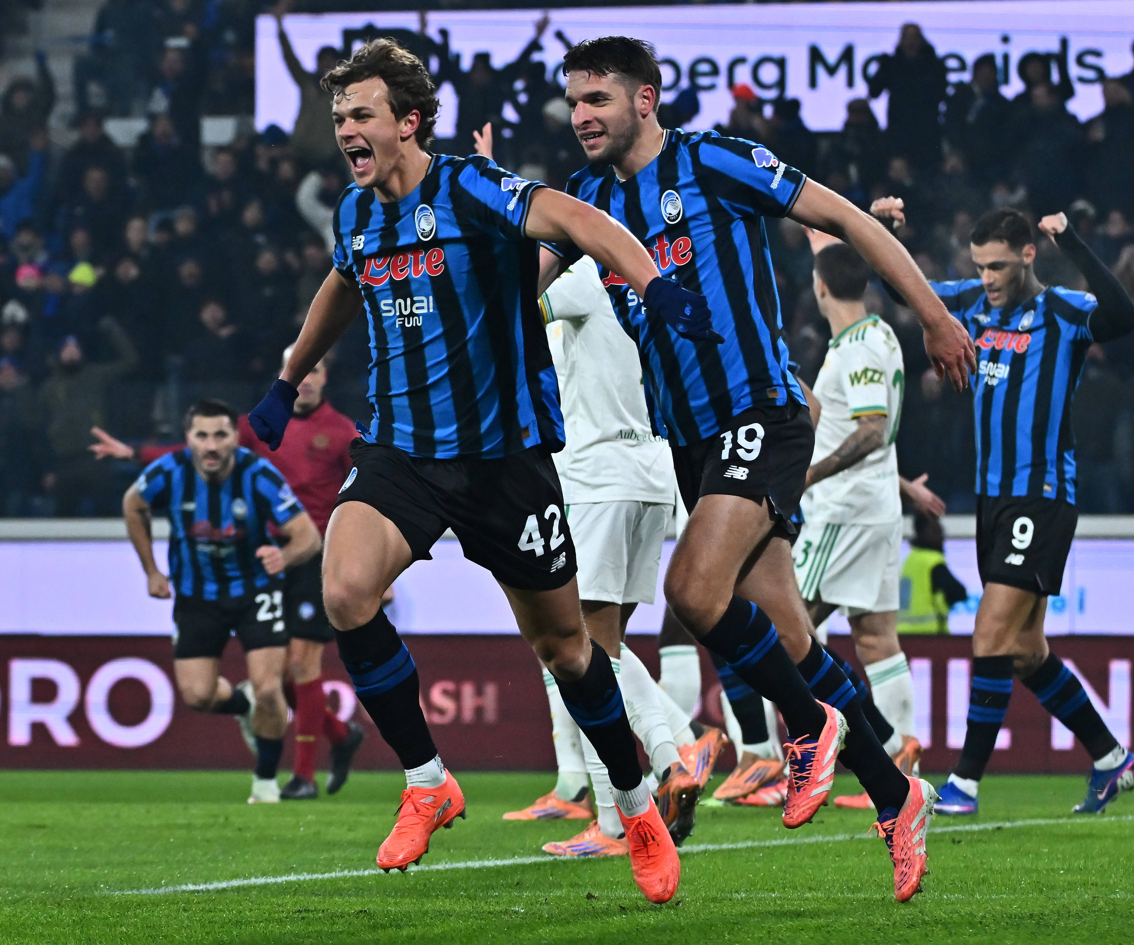 เมื่อวันที่ 3 มกราคม นักเตะอตาลันต้า สกาลวินี (คนที่สองจากซ้าย) ฉลองการทำประตู สำนักข่าวซินหัว (ภาพโดย อัลแบร์โต ลิงเกีย)