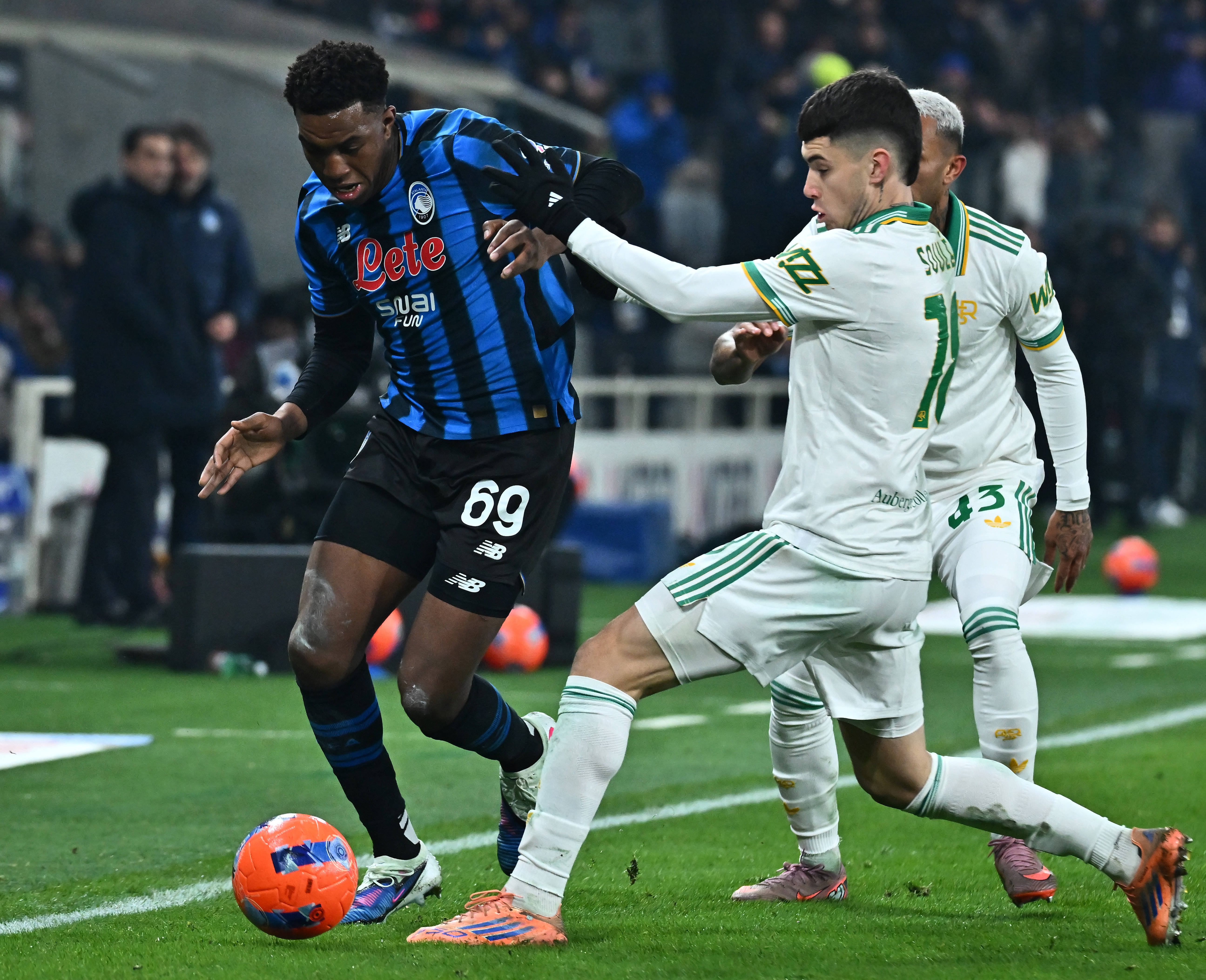 เมื่อวันที่ 3 มกราคม, นักเตะของอตาลันต้า ฌอน (ซ้าย) ท้าทายนักเตะของโรมา โดฟบิก ระหว่างการแข่งขัน. สำนักข่าวซินหัว (ภาพโดย อัลแบร์โต ลิงเลีย)