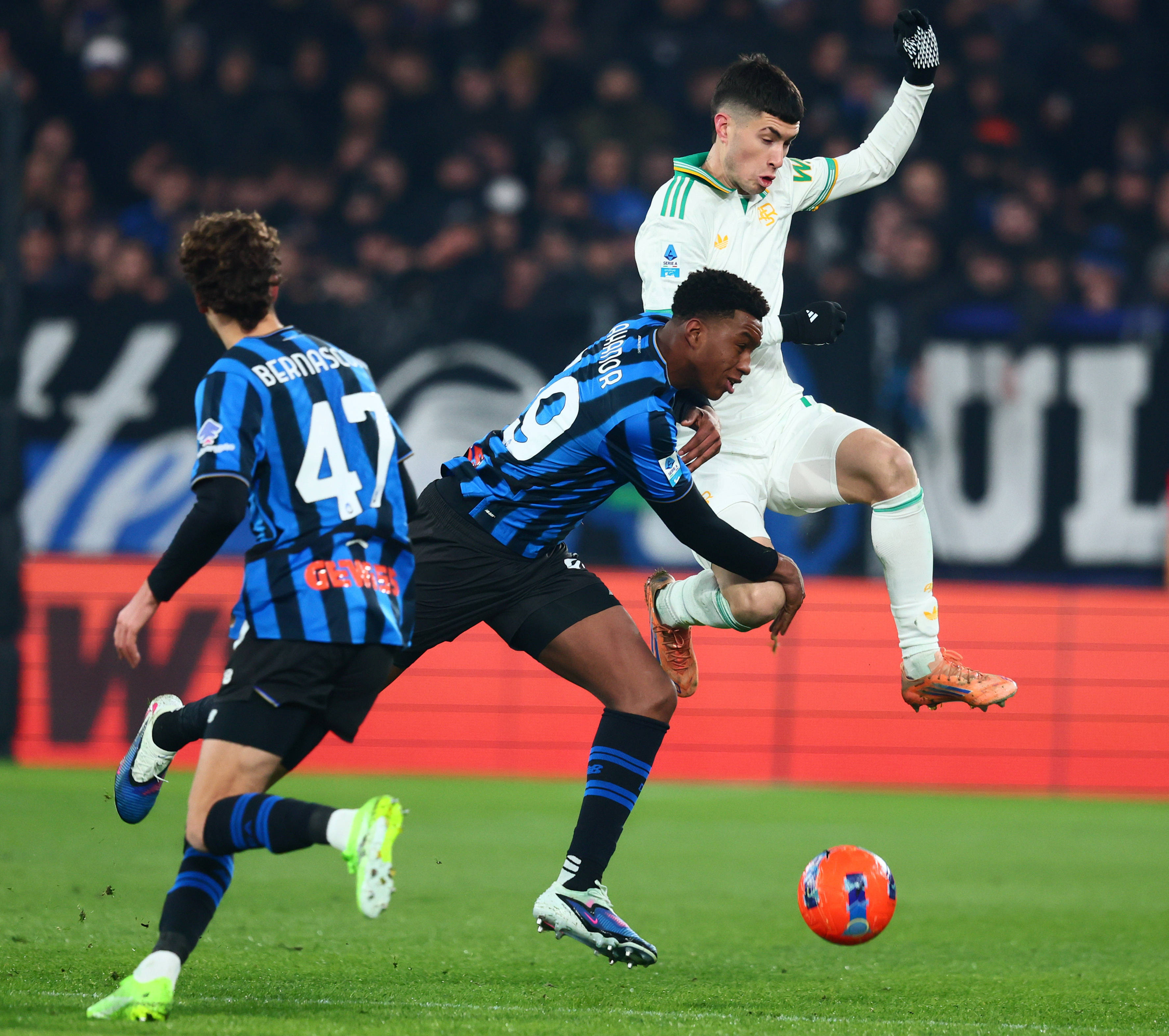เมื่อวันที่ 3 มกราคม นักเตะอตาลันต้า เบอร์นาสโคน (ซ้าย) และอาโนร์ (กลาง) กำลังท้าทายซูเลย์ของโรม่าในการแข่งขัน สำนักข่าวซินหัว (ภาพโดย อัลแบร์โต ลิงเกีย)