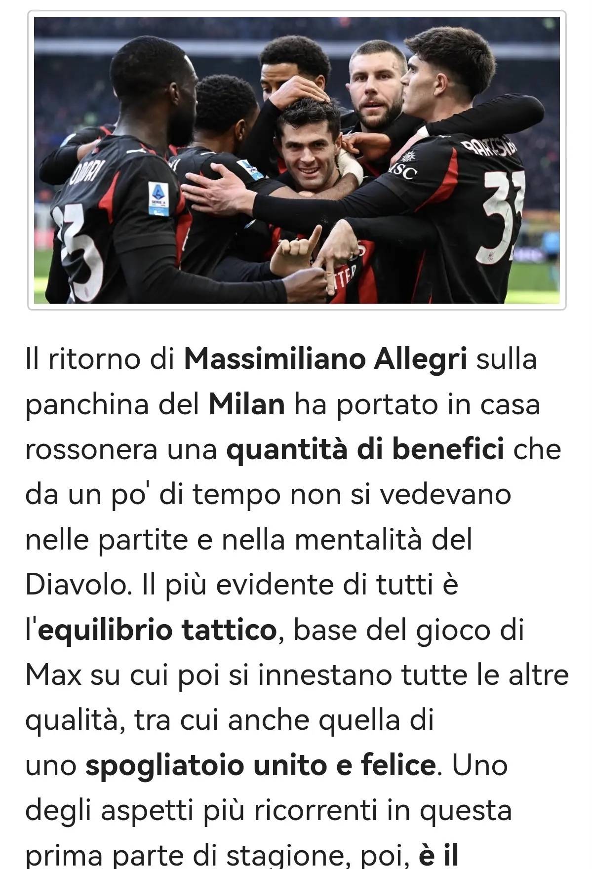 นับตั้งแต่ที่มัสซิมิเลียโน อัลเลกรีเข้ามารับตำแหน่งที่มิลาน เขาได้นำการเปลี่ยนแปลงเชิงคุณภาพมาสู่ทั้งผลงานในสนามของรอสโซเนรีและจิตวิญญาณของทีมโดยรวม ซึ่งเป็นการเปลี่ยนแปลงที่ไม่เคยเห็นมาก่อนในฤดูกาลก่อนๆ สิ่งที่เห็นได้ชัดเจนที่สุดคือความสมดุลทางแท็คติกภายในทีม ซึ่งเป็นรากฐานของปรัชญาการฝึกสอนของอัลเลกรี ลักษณะเฉพาะทั้งหมดของทีม ตั้งแต่บรรยากาศที่เหนียวแน่นไปจนถึงความลึกของทีมที่น่าเกรงขาม ล้วนสร้างขึ้นบนรากฐานนี้