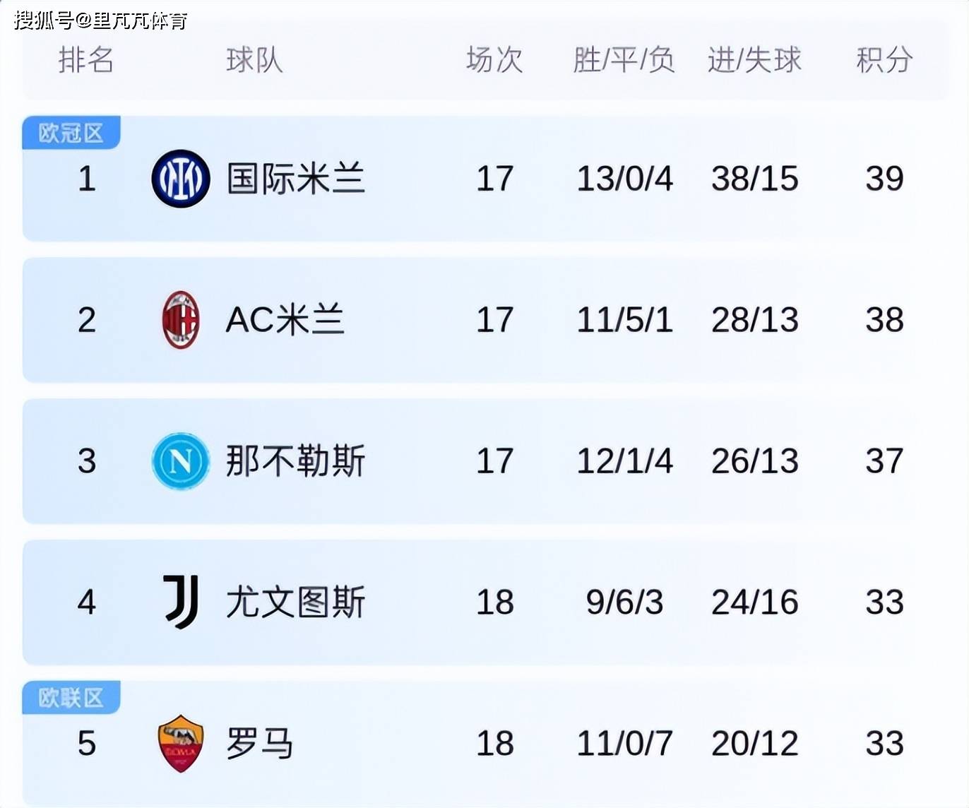 ในบรรดาทีมชั้นนำสามอันดับแรก อินเตอร์ มิลาน นำเป็นจ่าฝูงด้วยคะแนน 39 คะแนน โดยทำประตูได้ 38 ประตูใน 17 นัด ซึ่งถือเป็นทีมที่มีเกมรุกที่แข็งแกร่งที่สุดในลีก ขณะนี้พวกเขาอยู่ในอันดับแปดของแชมเปียนส์ลีก และได้ผ่านเข้าสู่รอบก่อนรองชนะเลิศของโคปปา อิตาเลีย