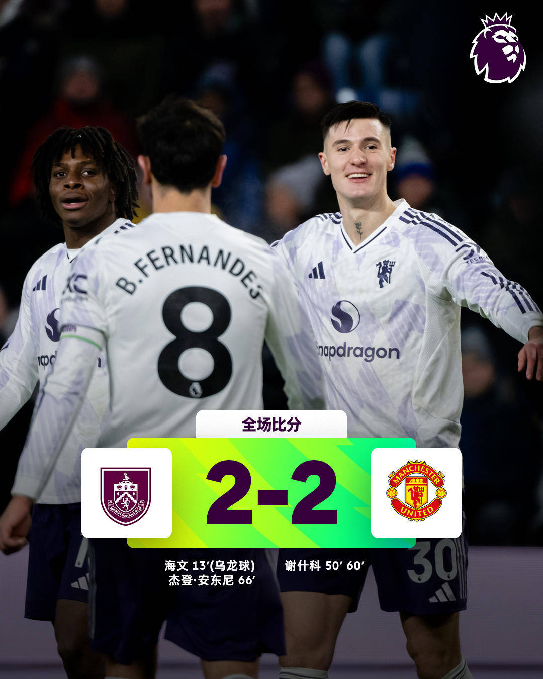 ในช่วงเช้าตรู่ของวันที่ 8 มกราคม ตามเวลาปักกิ่ง แมนเชสเตอร์ ยูไนเต็ด เดินทางไปยังสนามเทิร์ฟ มัวร์ เพื่อพบกับเบิร์นลีย์ ในการแข่งขันนัดสำคัญของพรีเมียร์ลีก รอบที่ 21 ในครึ่งแรก ฮัมฟรีย์ส์เปิดบอลไปโดนเท้าของเฮย์เวิร์ดและเปลี่ยนทางเข้าประตูในครึ่งหลัง เชสโกยิงสองประตูจากแอสซิสต์ของบรูโน่ แฟร์นันด์สและโดกัน ก่อนที่เจเดน แอนโทนี่จะยิงตีเสมอในช่วงท้ายเกม จบการแข่งขันด้วยสกอร์ 2-2 ทำให้ยูไนเต็ดเสมอเป็นนัดที่สามติดต่อกัน