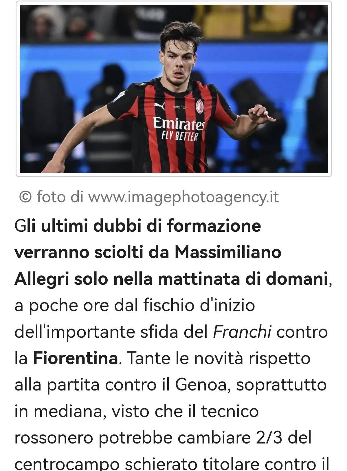 สื่ออิตาลีรายงาน: ในการแข่งขันระหว่างมิลานกับฟิออเรนตินา ยาสซีน อัสรี จะลงเล่นแทน ฟอฟานา ในตำแหน่งตัวจริง อัลเลกรี มิดฟิลด์ แมตช์