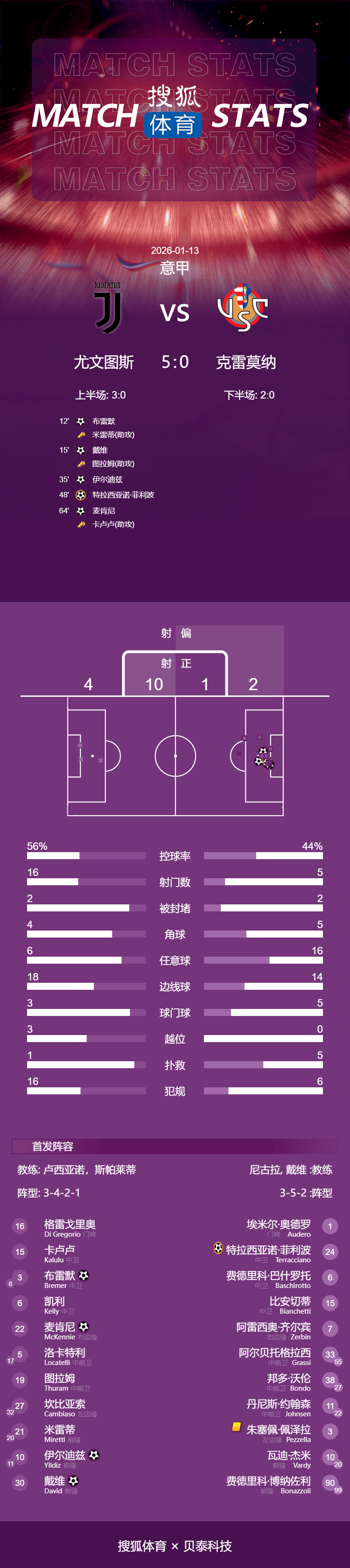 เวลา 03:45 น. ตามเวลาปักกิ่ง วันที่ 13 มกราคม ยูเวนตุสเปิดบ้านต้อนรับการมาเยือนของเครโมเนเซ่ที่สนามอัลลิอันซ์ สเตเดียม ในเกมการแข่งขันเซเรีย อา นัดที่ 20 ของฤดูกาล ในครึ่งแรก เบรเมอร์, ดิบาล่า และอิลดิซ ทำประตูติดต่อกัน ทำให้เจ้าบ้านขึ้นนำอย่างรวดเร็ว หลังจากพักครึ่ง ฟิลิปโปทำเข้าประตูตัวเอง ก่อนที่แม็คเคนนี่จะยิงปิดท้าย ยูเวนตุสเอาชนะเครโมเนเซ่ไปอย่างขาดลอย 5-0