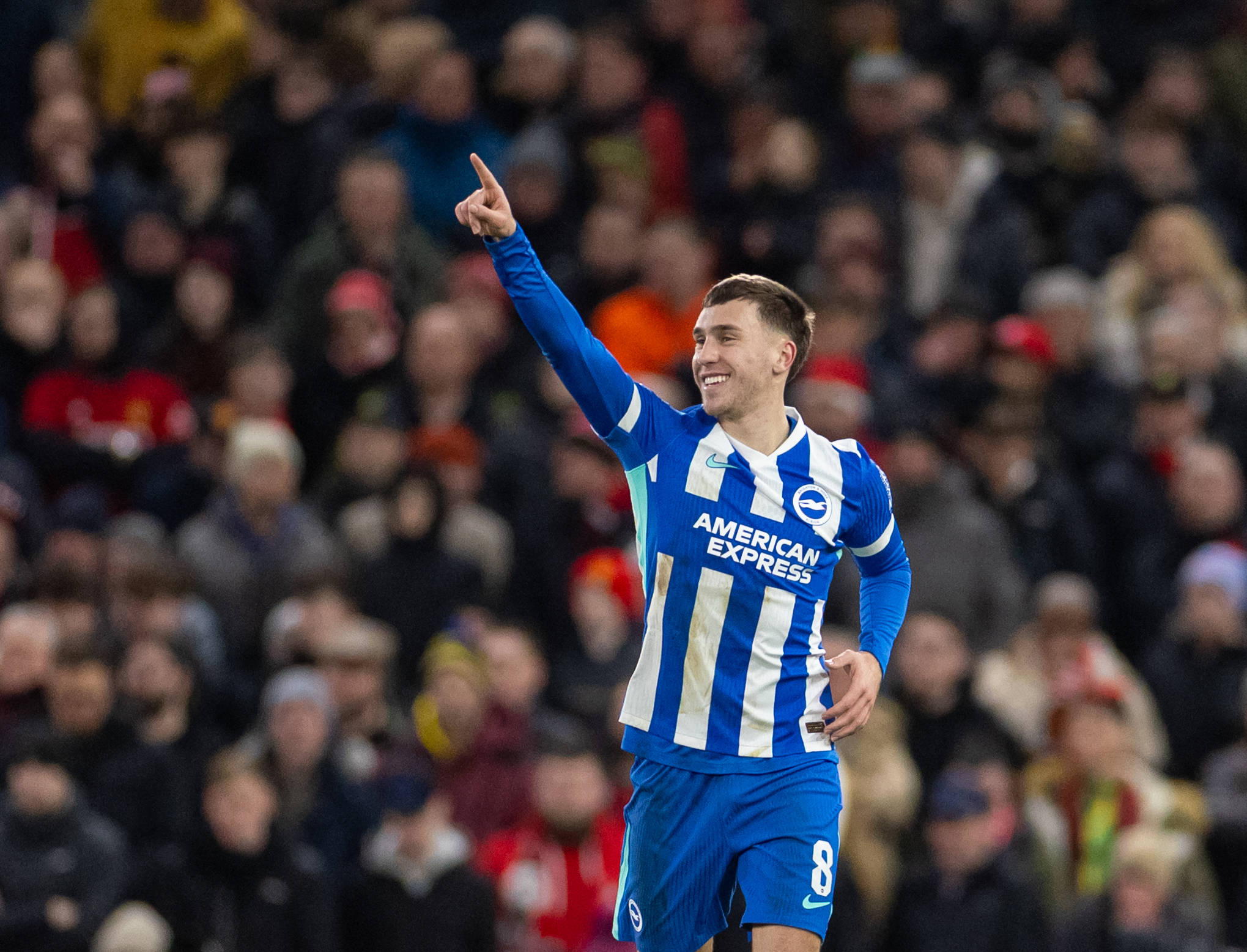 เมื่อวันที่ 11 มกราคม โจเอล เฟลต์มันน์ นักเตะของไบรตัน แอนด์ โฮฟ อัลเบี้ยน ฉลองการทำประตูได้ สำนักข่าวซินหัว