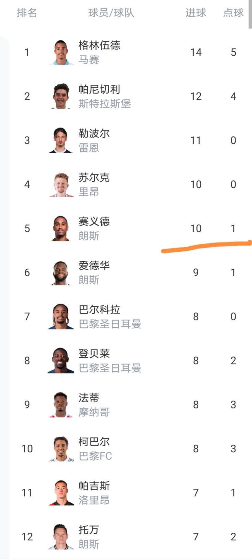ผู้เล่นห้าคนทำประตูได้สิบประตูหรือมากกว่าในตารางคะแนน โดยกรีนวูดนำอยู่สองประตู