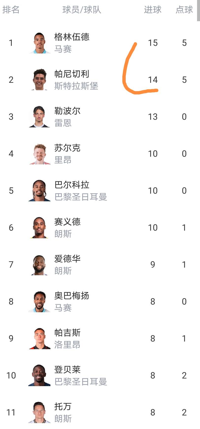 กรีนวูด นักเตะเก่าของแมนเชสเตอร์ ยูไนเต็ด ยังคงเป็นผู้นำ แต่ความได้เปรียบนั้นน้อยมาก และจะเห็นได้ว่ารายชื่อผู้ทำประตูในลีกเอิง 1 ไม่ได้ทำคะแนนผู้เล่นมากกว่า 20 คน