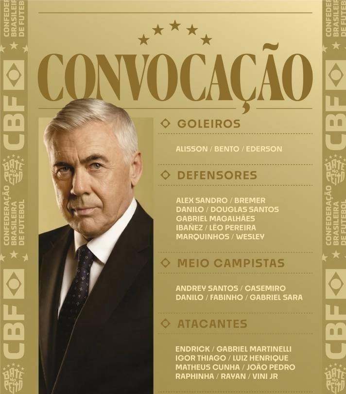 ส่งผลให้ วินิซิอุส และราฟินเนีย กลายเป็นสองคอร์ของกองหน้าชาวบราซิลรายใหม่นี้ และเลือดสดที่น่าตื่นเต้นคือ Endrek, 19 เด็กชายอัจฉริยะที่เซ็นสัญญากับเรอัล มาดริด และปัจจุบันยืมตัวในลียง ชนะการเรียกของอันเชล็อตติเป็นครั้งแรกด้วยผลงานที่โดดเด่นของเขา 6 ประตูจาก 12 เกม นอกจากนี้ ยังได้รับเลือกให้ทีมชาติชุดใหญ่ ได้แก่ อิกอร์ ติอาโก้ กองหน้าของเบรนท์ฟอร์ด, ลายัน ปีกของบอร์นมัธ, กาเบรียล ซารา กองกลางของกาลาตาซาราย และ ริโอ เปเรร่า กองหลังของฟลาเมงโก ผู้มาใหม่ทั้งสี่คนนี้จะเปิดตัวอาชีพในทีมชาติ
