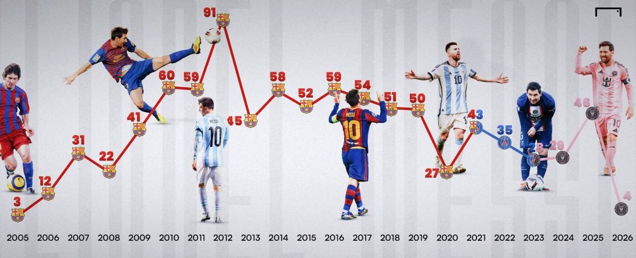 จำนวนประตูที่ยิงได้ทุกปีในอาชีพของเมสซี่ 91 ประตูในปี 2012 อาจเป็นสถิติที่ไม่เคยมีมาก่อนในวงการฟุตบอล 900 ลูกกำลังจะมา 1,000 ลูกจะตามหลัง? บางทีดวงตาของเมสซี่อาจไม่มี "ลูกบอลพัน" ที่ยิ่งใหญ่ และเขาให้ความสำคัญอย่างยิ่งกับความสำเร็จของอาร์เจนตินาในฟุตบอลโลกปี 2026 ที่เม็กซิโกและเม็กซิโก ในฐานะราชาบอล เมสซี่ เป็นเรื่องของแน่นอน และไม่จำเป็นต้องสนใจอะไรมาก เมสซี่เป็นวิธีการเตะแบบทีม และตอนนี้ทักษะที่แข็งแกร่งที่สุดของเมสซี่คือการจ่ายบอลโดยตรงและฟรีคิก!