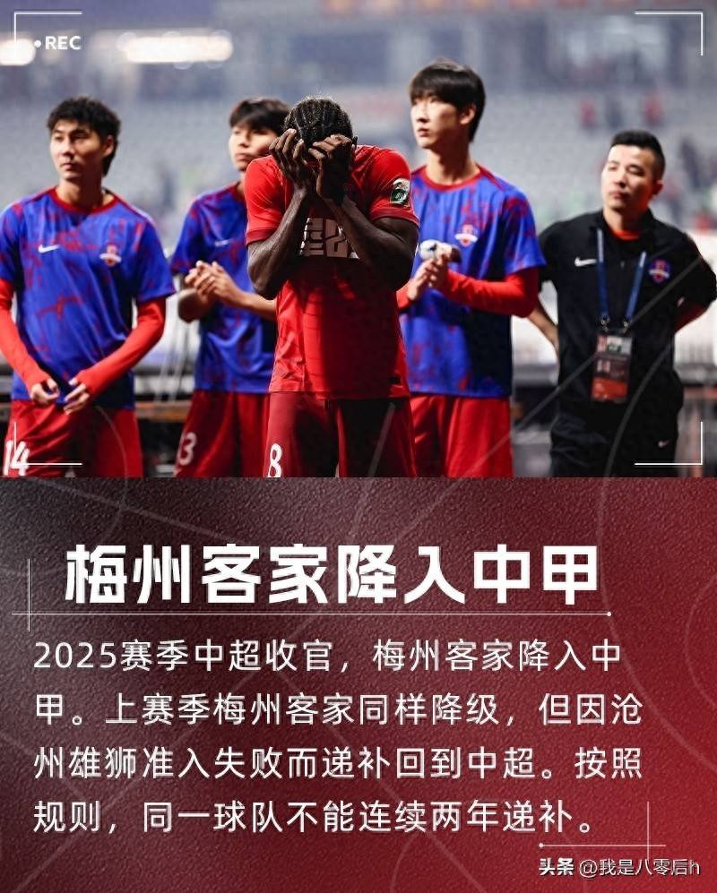 เมื่อวันที่ 22 พฤศจิกายน เวลาปักกิ่ง การแข่งขัน 8 นัดสุดท้ายของรอบที่ 30 ของไชนีส ซูเปอร์ลีก ได้สิ้นสุดลง หลังจากที่ทีมเมย์โจว ฮากกา พ่ายแพ้ 1-5 ในเกมเยือนต่อปักกิ่ง กั๋วอัน ทำให้สโมสรจบฤดูกาลด้วยสถิติชนะ 5 นัด เสมอ 6 นัด และแพ้ 19 นัด สะสมได้ 21 คะแนน อยู่ในอันดับที่ 15 ของตารางลีก และจะต้องตกชั้นไปเล่นในไชน่า ลีก วัน ในฤดูกาล 2026