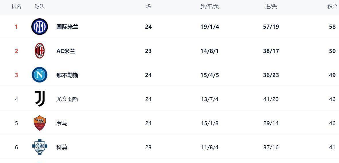 ตารางคะแนนเซเรียอาในขณะนี้กำลังน่าสนใจเป็นอย่างมาก อินเตอร์ มิลาน นำเป็นจ่าฝูงด้วยคะแนน 58 คะแนน แม้จะแพ้ไป 4 นัด แต่พวกเขามีจำนวนชัยชนะมากที่สุดในลีกทั้งหมด 19 นัด ซึ่งทำให้พวกเขารักษาตำแหน่งจ่าฝูงไว้ได้