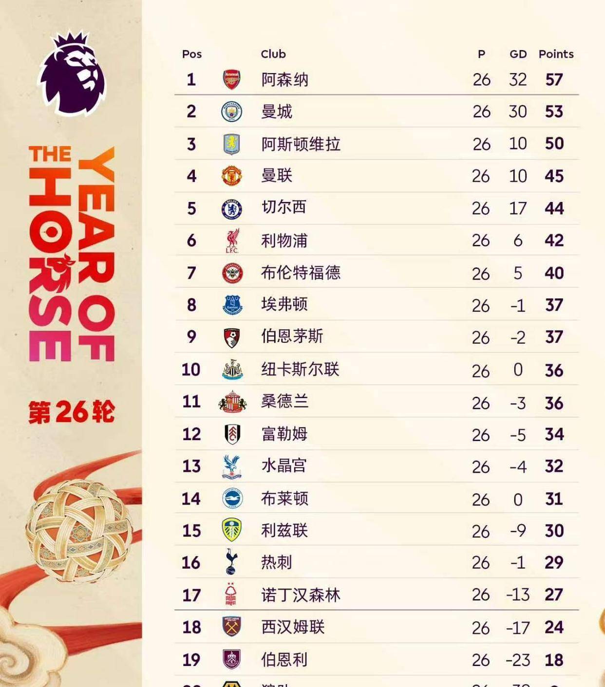 ในช่วงเช้าตรู่ของวันที่ 13 กุมภาพันธ์ ตามเวลาปักกิ่ง การแข่งขันนัดสุดท้ายของรอบที่ 26 ของพรีเมียร์ลีกได้สิ้นสุดลงที่สนามคอมมูนิตี้ สเตเดียม ของเบรนท์ฟอร์ด ทีมจ่าฝูงอย่างอาร์เซนอลขึ้นนำได้ตั้งแต่ต้นเกม แต่เจ้าบ้านก็ตีเสมอได้สำเร็จด้วยลูกทุ่มลูกสูตร 'ระเบิดมือ' อันเป็นเอกลักษณ์ของพวกเขา จบเกมด้วยผลเสมอ 1-1 ในช่วงเวลาสุดท้ายของการแข่งขัน กาเบรียล มาร์ติเนลลี ตัวสำรองได้พลาดโอกาสทองในการทำประตูแบบตัวต่อตัว เกือบทำให้ทีมปืนใหญ่เสียแม้แต้มพื้นที่เดียวนี้ การเสมอครั้งนี้ทำให้แฟนบอลอาร์เซนอลต้องลุ้นระทึก เนื่องจากเพียงไม่กี่ชั่วโมงก่อนหน้านี้ คู่แข่งสำคัญในการลุ้นแชมป์อย่างแมนเชสเตอร์ ซิตี้ ได้เอาชนะฟูแล่มไปอย่างขาดลอย 3-0 ที่สนามเอติฮัด สเตเดียม