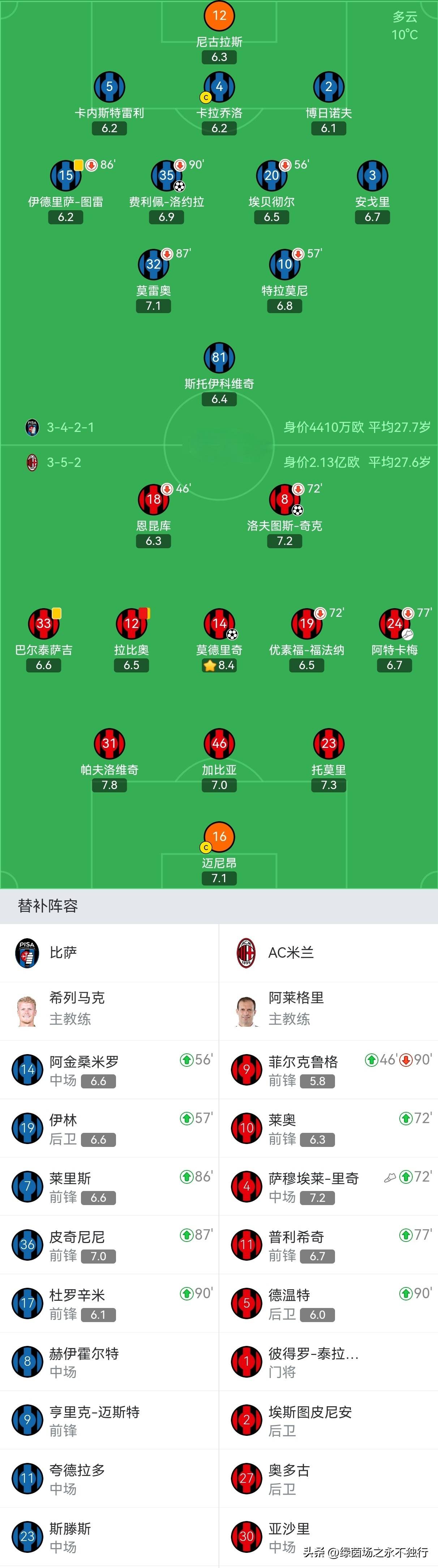 ในนาทีที่ 71 พิซาตีเสมอได้สำเร็จเมื่อลอยโอลาซัดบอลเข้าประตูจากในเขตโทษ ทำให้สกอร์เป็น 1-1