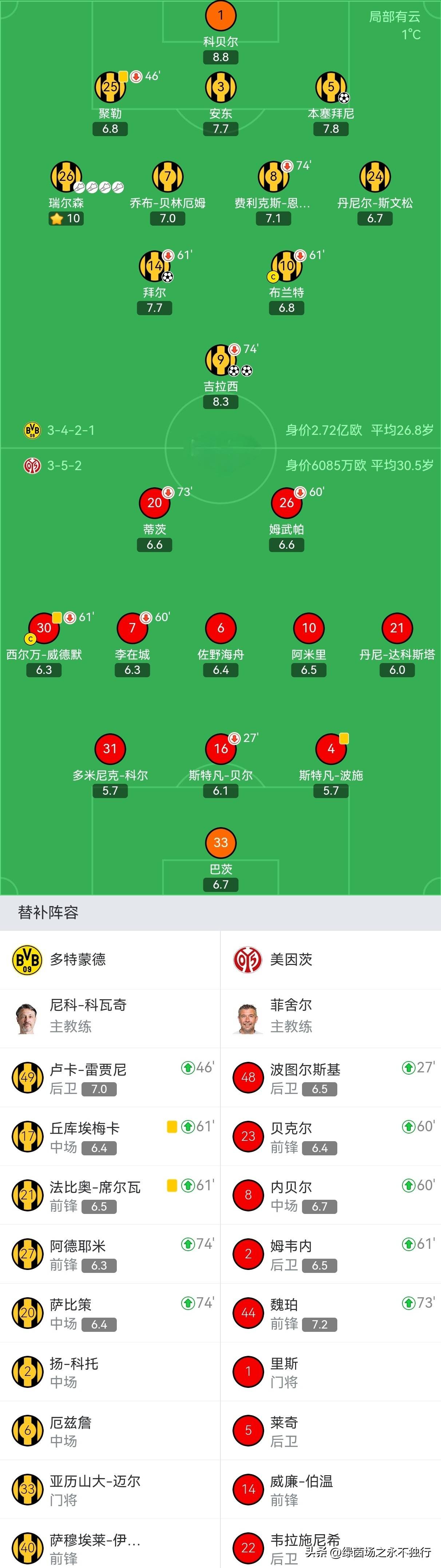 ในนาทีที่ 84 ลูกเตะมุมของเรอุสส่งผลให้ไมนซ์ทำเข้าประตูตัวเอง ปิดท้ายชัยชนะของโบรุสเซีย ดอร์ทมุนด์ 4-0