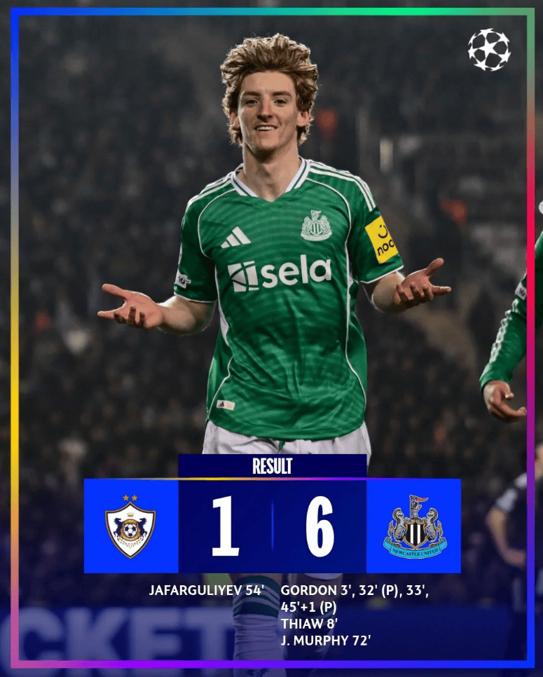 นิวคาสเซิล ยูไนเต็ด ถล่ม คาราบัค 6-1 ในเกมเยือนที่อาเซอร์ไบจาน เกือบการันตีการผ่านเข้ารอบ 16 ทีมสุดท้าย กอร์ดอนโชว์ฟอร์มสุดยอดด้วยการยิงคนเดียวสี่ประตูในครึ่งแรก ในนาทีที่สาม กอร์ดอนรับบอลทะลุช่องก่อนจะหลุดเข้าไปทางฝั่งขวาของเขตโทษแล้วยิงด้วยเท้าขวาเข้าไปอย่างเฉียบขาดในนาทีที่แปด ทริปเปียร์เปิดลูกเตะมุมซึ่งถูกเคลียร์ออกไปในตอนแรก แต่การครอสครั้งต่อมาของเขาไปเข้าหัวของแกฟฟ์ ซึ่งโหม่งเข้าไปเป็นประตูที่สองให้ทีมนำห่าง ในนาทีที่ 32 บาร์นส์ได้จุดโทษหลังจากคาราบัคทำแฮนด์บอลในกรอบเขตโทษ กอร์ดอนยิงจุดโทษเข้าไปอย่างเยือกเย็น ขยายความได้เปรียบของนิวคาสเซิลเป็น 3-0
