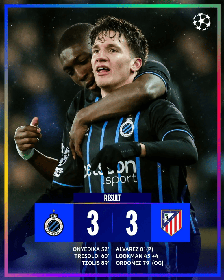 ในนาทีที่ 79 แอตเลติโกกลับขึ้นนำอีกครั้งจากการเปิดบอลทางฝั่งขวาของญอเรนเต้ที่ทำให้โอดอนีซเปลี่ยนทิศทางบอลเข้าประตูตัวเอง อย่างไรก็ตาม ในนาทีที่ 89 คลับ บรูจจ์ฉวยโอกาสโต้กลับอย่างรวดเร็ว: โอนเยดิก้าหมุนตัวและจ่ายบอลทะลุช่องให้โซลลิยิงผ่านผู้รักษาประตูเข้าไปอย่างเยือกเย็น ทำให้เสมอกันอย่างน่าตื่นเต้นทั้งสองฝ่ายเปิดฉากแลกประตูกันอย่างดุเดือด ก่อนจะจบเกมด้วยการแบ่งแต้มกันไปแบบสุดมันส์ 3-3 ส่งผลให้ผลการแข่งขันนัดนี้ยังต้องลุ้นกันต่อในนัดที่สอง! ที่น่าสังเกตคือ นี่เป็นครั้งแรกในประวัติศาสตร์ของแอตเลติโกที่พวกเขากลับมาเสียประตูหลังจากนำห่างสองประตูในศึกยูฟ่า แชมเปียนส์ลีก และยังไม่สามารถเอาชนะทีมจากเบลเยียมได้เลย โดยเสมอ 2 นัดและแพ้ 5 นัด