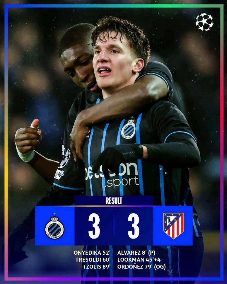 ในการแข่งขันอีกสองนัด แอตเลติโก มาดริด เสมอกับ คลับ บรูจจ์ 3-3 ในเกมเยือน ขณะที่ ไบเออร์ เลเวอร์คูเซ่น เอาชนะ โอลิมเปียกอส 2-0 ในเกมเยือนเช่นกัน แอตเลติโก มาดริด นำ 2-0 ในช่วงระหว่างเกม แต่บรูจจ์กลับมาสู้อย่างหนักและตีเสมอได้ แอตเลติโก มาดริด นำ 1-0 จากจุดโทษที่ อัลบาเรซ ยิงเข้าไปในนาทีที่ 6 ของครึ่งแรก หลังจากที่ เซสเซญง ของบรูจจ์ ทำแฮนด์บอลในเขตโทษในช่วงทดเวลาบาดเจ็บครึ่งแรก อัลบาเรซเปิดลูกเตะมุมซึ่งกรีซมันน์โหม่งต่อให้ลูกแมนยิงเข้าไปง่ายๆเป็น 2-0! สถานการณ์พลิกผันอย่างน่าทึ่งหลังจากพักครึ่ง ในนาทีที่ 52 คลับ บรูจจ์ได้ลูกเตะมุมซึ่งโอนเยดิกายิงซ้ำเข้าไป ทำให้สกอร์เป็น 2-1! จากนั้นในนาทีที่ 60 เทรสโซลดีวอลเลย์เข้าประตูไปทำให้เสมอกัน 2-2!ในนาทีที่ 79 ลlorente ส่งบอลข้ามไปให้ Odonez ทำเข้าประตูตัวเอง ทำให้สกอร์เป็น 3-2! แต่ในนาทีที่ 89 Zolli ทำประตูด้วยลูกยิงเดี่ยว ทำให้สกอร์กลับมาเสมอกันที่ 3-3.