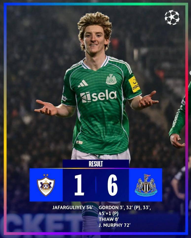 ในความแตกต่างอย่างสิ้นเชิงกับความพ่ายแพ้ต่ออินเตอร์ มิลาน นิวคาสเซิล ยูไนเต็ด ได้แสดงผลงานอันน่าประทับใจในเกมเยือน แม็กพายส์ถล่มคาราบัก 6-1 ที่บากู อาเซอร์ไบจาน เกือบจะการันตีการผ่านเข้ารอบ 16 ทีมสุดท้าย กอร์ดอนเป็นดาวเด่นของทีมอย่างไม่ต้องสงสัย โดยทำผลงานอันน่าทึ่งด้วยการยิง 4 ประตูในครึ่งแรกเพียงอย่างเดียวเพียงสามนาทีแรก กอร์ดอนรับบอลทะลุช่องอย่างแม่นยำ ฝ่าเข้าไปทางฝั่งขวาของกรอบเขตโทษ ก่อนยิงด้วยเท้าขวาอย่างเยือกเย็นเข้าไปตุงตาข่าย – 1-0! ในนาทีที่แปด ครอสจากลูกเตะมุมของทริปเปียร์ถูกกองหลังคาราบัคสกัดออกมา แต่บอลมาเข้าทางทริปเปียร์อีกครั้งที่เปิดบอลไปให้ กัฟเฟอร์ โหม่งเข้าไปเป็น 2-0!ในนาทีที่ 32 บาร์นส์ถูกทำแฮนด์บอลในกรอบเขตโทษ ทำให้ผู้ตัดสินเป่าจุดโทษ กอร์ดอนยิงจุดโทษเข้าไปอย่างเยือกเย็น ทำให้สกอร์เป็น 3-0! เพียงนาทีเดียวต่อมา กอร์ดอนได้โอกาสอีกครั้งในการเผชิญหน้ากับผู้รักษาประตู เขาเลี้ยงบอลหลบผู้รักษาประตูอย่างใจเย็นและยิงเข้าไปในประตูที่ว่างเปล่า ทำให้เขาทำแฮตทริกได้สำเร็จและทำให้สกอร์เป็น 4-0!ในช่วงทดเวลาบาดเจ็บของครึ่งแรก กอร์ดอนได้จุดโทษอีกครั้งในกรอบเขตโทษและยิงเข้าไปเอง ทำให้เขายิงครบสี่ประตู: 5-0!