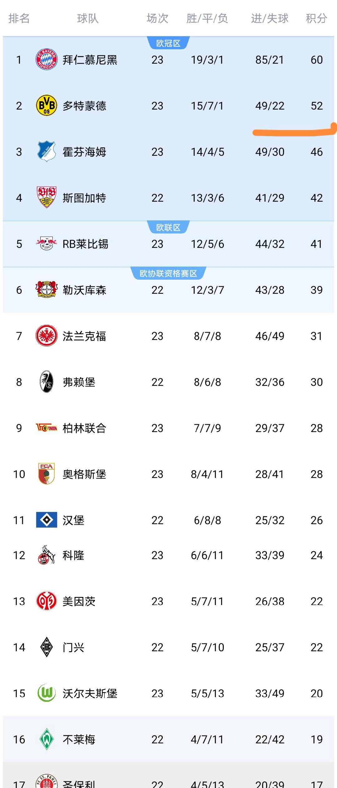 เมื่อดูตารางคะแนน บาเยิร์น มิวนิค คว้าชัยชนะในรอบนี้ ทำให้พวกเขามีคะแนนสะสมเพิ่มเป็น 60 คะแนน รักษาตำแหน่งผู้นำอย่างเหนียวแน่น ขณะที่ โบรุสเซีย ดอร์ทมุนด์ ไม่สามารถเก็บชัยชนะได้ ทำให้ช่องว่างระหว่างพวกเขากับ บาเยิร์น มิวนิค ขยายเป็น 8 คะแนน ซึ่งลดความตื่นเต้นในการแข่งขันชิงแชมป์ในฤดูกาลนี้ลงอย่างมาก ไรส์บวร์ก ที่เสมอกับ ดอร์ทมุนด์ อยู่ในอันดับที่ 4 มีคะแนนสะสม 41 คะแนน ตามหลัง สตุ๊ตการ์ท ที่อยู่ในอันดับที่ 4 เพียง 1 คะแนน สถานการณ์ยังคงแข่งขันกันอย่างดุเดือดความพ่ายแพ้ของไบเออร์ เลเวอร์คูเซ่น ทำให้พวกเขามี 39 คะแนน ตามหลังไลป์ซิกที่อยู่อันดับห้าอยู่สองคะแนน ซึ่งชี้ให้เห็นถึงความจำเป็นเร่งด่วนที่ทีมต้องปรับปรุงฟอร์มการเล่นของพวกเขา โดยเฉพาะอย่างยิ่ง ชัยชนะของยูเนียน เบอร์ลิน ทำให้พวกเขามี 28 คะแนน ไล่ตามไฟร์บวร์กเข้ามาใกล้ขึ้น ในขณะที่การต่อสู้เพื่อคว้าตั๋วไปเล่นในยุโรปกำลังเข้มข้นขึ้น