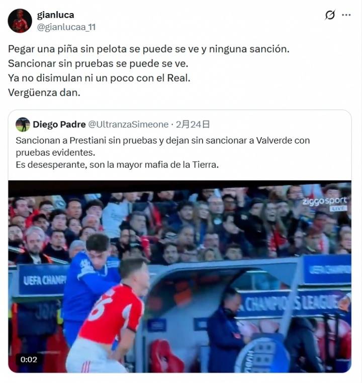 เมื่อวันที่ 26 กุมภาพันธ์ เวลาปักกิ่ง ยูฟ่าได้ปฏิเสธคำอุทธรณ์ของเบนฟิก้าอย่างเป็นทางการ โดยยืนยันโทษแบน 1 นัดที่ลงโทษผู้เล่นของเบนฟิก้า เพรสเตียนี ในข้อหาถูกกล่าวหาว่ามีการเลือกปฏิบัติทางเชื้อชาติ หลังจากนั้น เพรสเตียนีได้โพสต์บนโซเชียลมีเดียเพื่อวิจารณ์ยูฟ่าอย่างรุนแรง โดยกล่าวหาว่าองค์กรปกครองนี้เข้าข้างเรอัล มาดริด อย่างไรก็ตาม เขาได้ลบโพสต์ดังกล่าวออกไปแล้ว