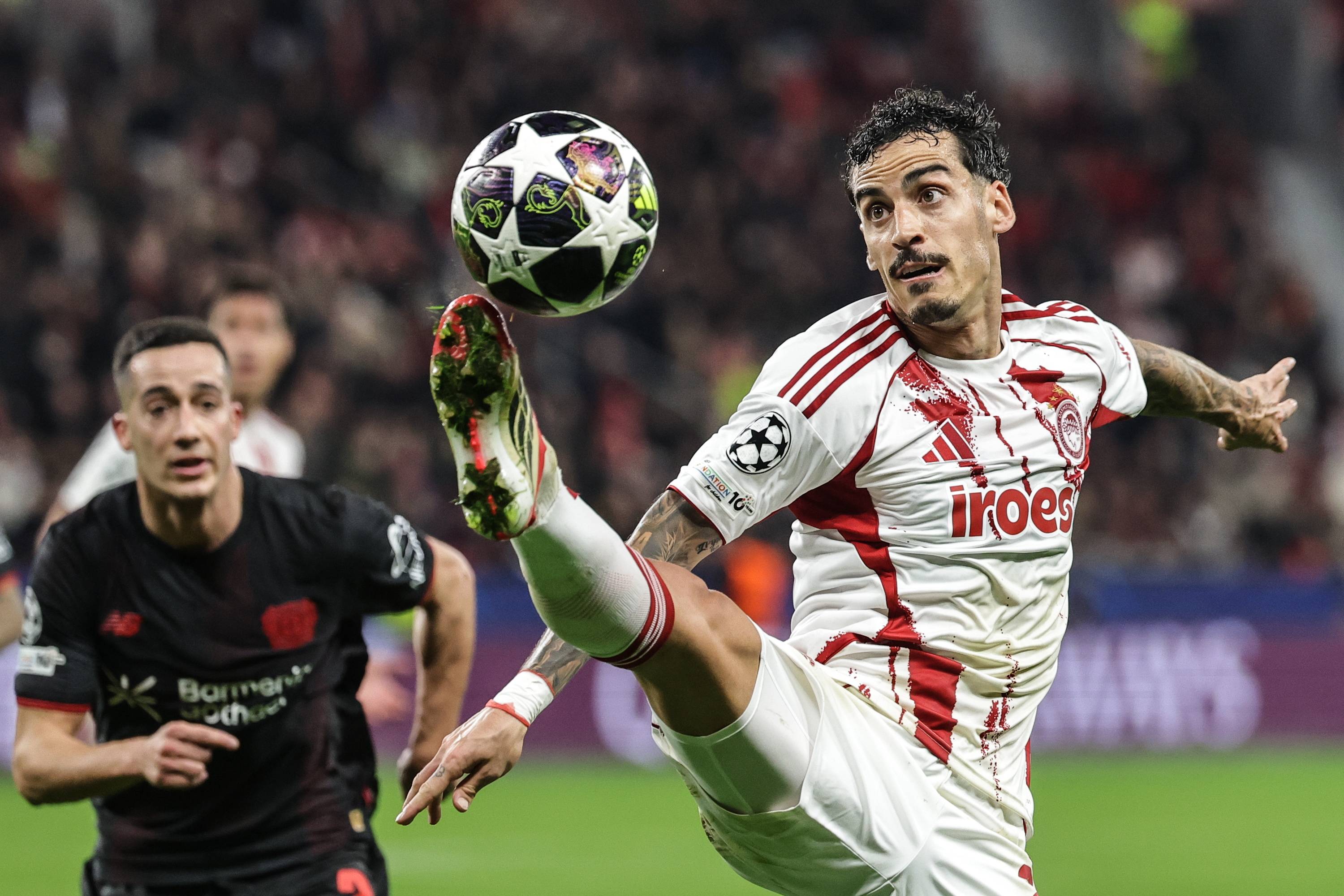 เมื่อวันที่ 24 กุมภาพันธ์ ลูคัส บาซเกซ (ซ้าย) ของไบเออร์ เลเวอร์คูเซ่น เข้าปะทะกับ ชิคินโญ่ ของโอลิมเปียกอส เพื่อแย่งบอล ชินหัว/EPA