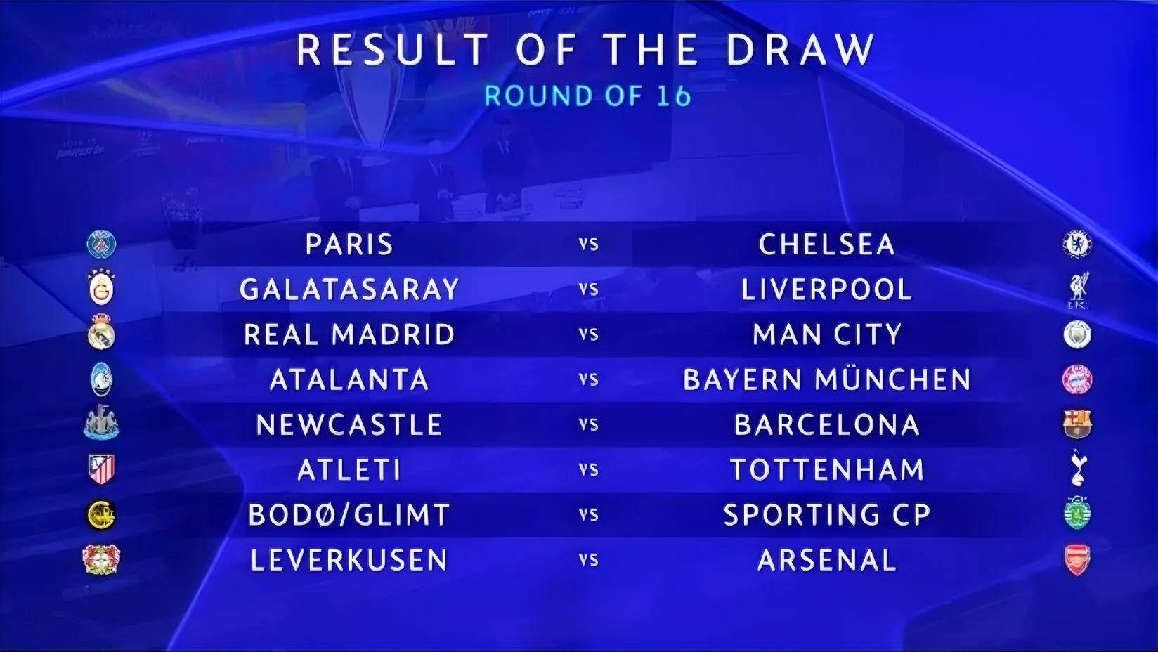 เมื่อวันที่ 27 กุมภาพันธ์ เวลาปักกิ่ง การจับสลากรอบ 16 ทีมสุดท้ายของยูฟ่าแชมเปียนส์ลีกฤดูกาล 2025/26 ได้เสร็จสิ้นลงอย่างเป็นทางการ เผยให้เห็นการแข่งขันที่น่าจับตามองในวงการฟุตบอลยุโรป แมนเชสเตอร์ ซิตี้ และเรอัล มาดริด จะเผชิญหน้ากันในศึกใหญ่ตั้งแต่รอบแรก ขณะที่เชลซีต้องเจอศึกหนักกับปารีส แซงต์-แชร์กแมง บาร์เซโลนา และบาเยิร์น มิวนิก ได้จับสลากในสายที่ดูเป็นใจ โดยทั้งหกทีมจากพรีเมียร์ลีกผ่านเข้าสู่รอบน็อคเอาท์ได้สำเร็จ รูปแบบการแข่งขันใหม่สัญญาว่าจะสร้างความตื่นเต้นสูงสุดตลอดรอบน็อคเอาท์
