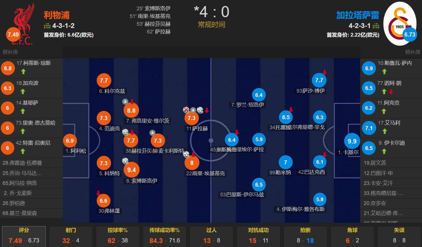 ลิเวอร์พูล vs กาลาตาซาเร่, สล็อต 4312 ฟอร์ม เอกิติก และซาลาห์ ฟอร์มสองหน้า หลังเขาคือ แม็คคาลิสต์, โซโบสลอย, เฮอร์ฟินเบค และ เวลซ์ ฟอร์มมิดฟิลด์ 3 ตัว, ฟลายแมง, คอร์นัท, ฟาน แดคซ์, เคลคาอิซ ฟอร์ม 4 แบ็ค, อลิสซง ประตู มูลค่า 660 ล้านยูโร บรู๊ค 4231 ฟอร์มเริ่ม 2.2 พันล้านยูโร