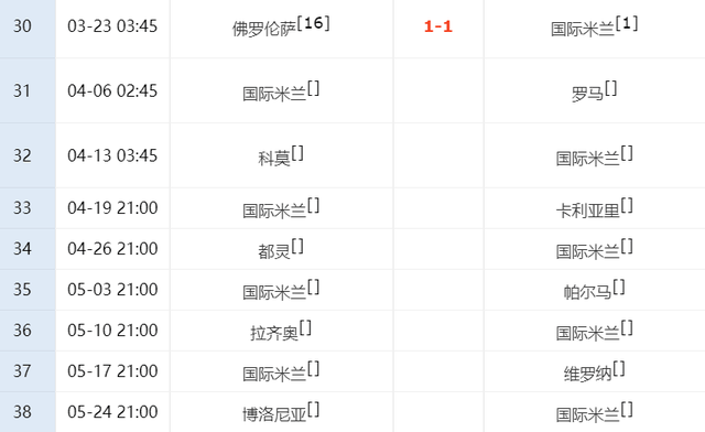 ตามตารางการแข่งขันหลังจากวันเกมทีมชาติ อินเตอร์ มิลาน จะพบกับโรมที่บ้าน และจากนั้นเล่นเป็นแขกรับเชิญกับโคโม ทั้งสองทีมได้ฆ่าอย่างบ้าคลั่งเพื่อแข่งขันที่สี่ อินเตอร์ มิลาน พบกับคู่ต่อสู้ทั้งสองนี้ และอาจเสียแต้มได้ทุกเมื่อ ในรอบที่ 36 อินเตอร์ มิลานจะเป็นแขกรับเชิญกับลาซิโอ และรอบสุดท้ายจะเล่นโบโลญญาบนท้องถนน สองเกมนี้ก็ยากมากเช่นกัน กล่าวคือ ในรอบ 8 ทีมสุดท้าย อินเตอร์ มิลาน จะเล่นกับ 4 ทีมที่แข็งแกร่ง ในไม่กี่เกมนี้ เมื่อ อินเตอร์ มิลาน เสีย 6 แต้มขึ้นไป พวกเขามีแนวโน้มที่จะเสียโอกาสในการแข่งขันเพื่อชิงแชมป์