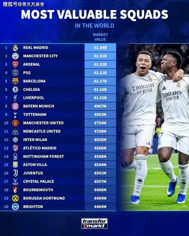 ตลาดซื้อขายนักเตะเยอรมันประกาศมูลค่าสโมสรใหม่ เรอัล มาดริด เริ่ม 13 ยอด 400 ล้านยูโร แมนเชสเตอร์ ซิตี้ 13 100 ล้านยูโร ตามด้วยอาร์เซนอล 12 300 ล้านยูโรอยู่ในอันดับที่สาม