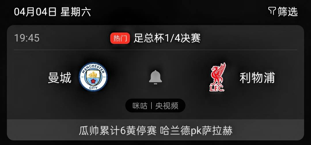 เมื่อเวลา 19:45 น. ของวันที่ 4 เมษายน ตามเวลาปักกิ่ง นัดแรกของการแข่งขัน FA Cup รอบรองชนะเลิศของอังกฤษในฤดูกาล 25/26 จะจัดขึ้นในนัดแรก แมนฯ ซิตี้ จะลงเล่นในบ้านกับลิเวอร์พูลที่บ้าน น็อคเอาท์ FA Cup 1/4 จะเป็นชัยชนะหรือผู้แพ้ครั้งสุดท้าย ผู้ชนะในเกมนี้จะเป็นคนแรกที่ก้าวขึ้นสู่ 4 อันดับแรกของเอฟเอ คัพ ในฤดูกาลนี้