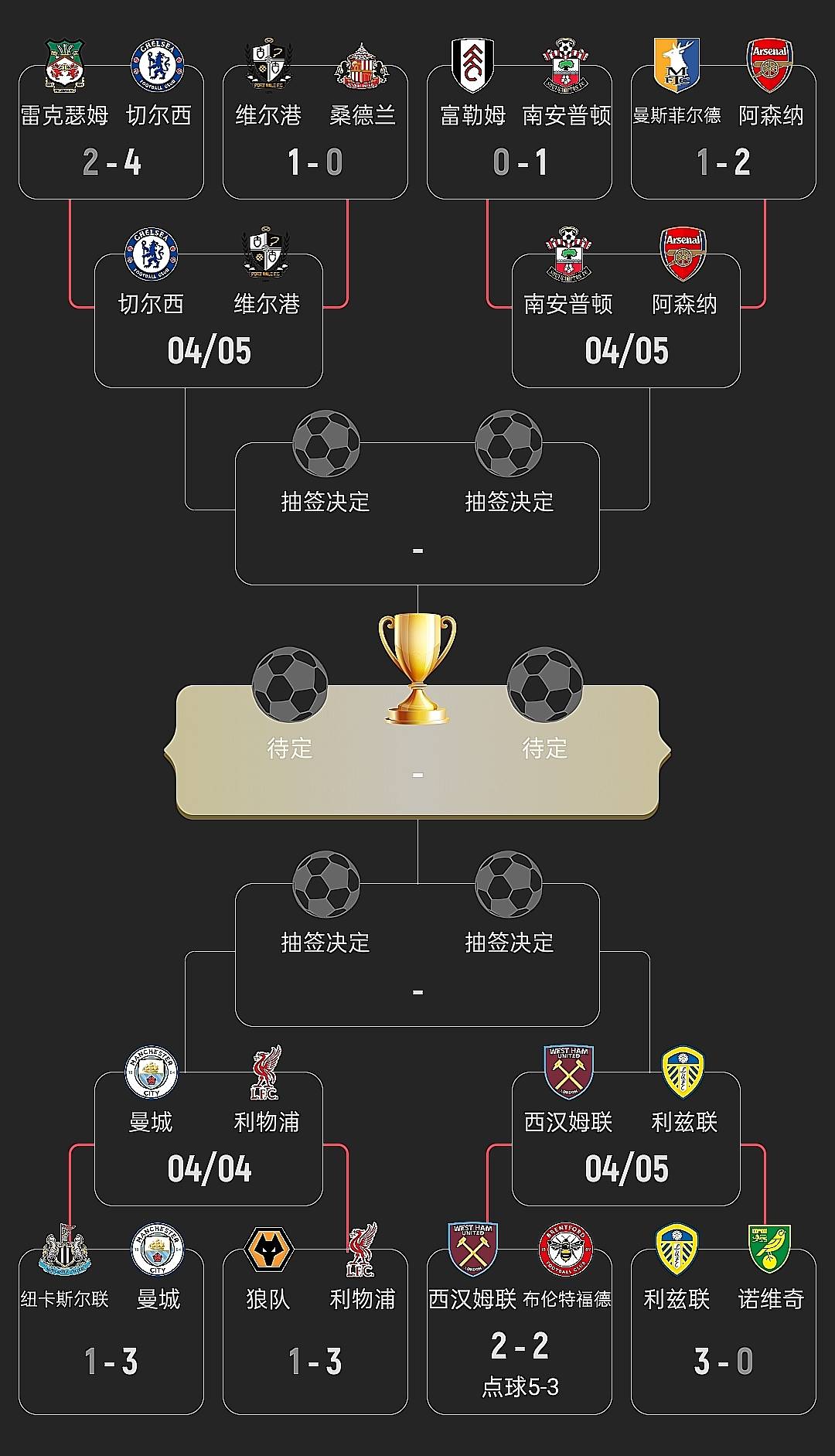 อีก 6 ทีมที่จะก้าวไปสู่ 8 ทีมชั้นนำจะมีการประลองสองสองนัดในวันพรุ่งนี้ ไม่ว่าจะเป็นแมนเชสเตอร์ ซิตี้ หรือลิเวอร์พูล พวกเขาจะเล่นกับผู้ชนะเวสต์แฮมและลีดส์ ยูไนเต็ดในรอบรองชนะเลิศ
