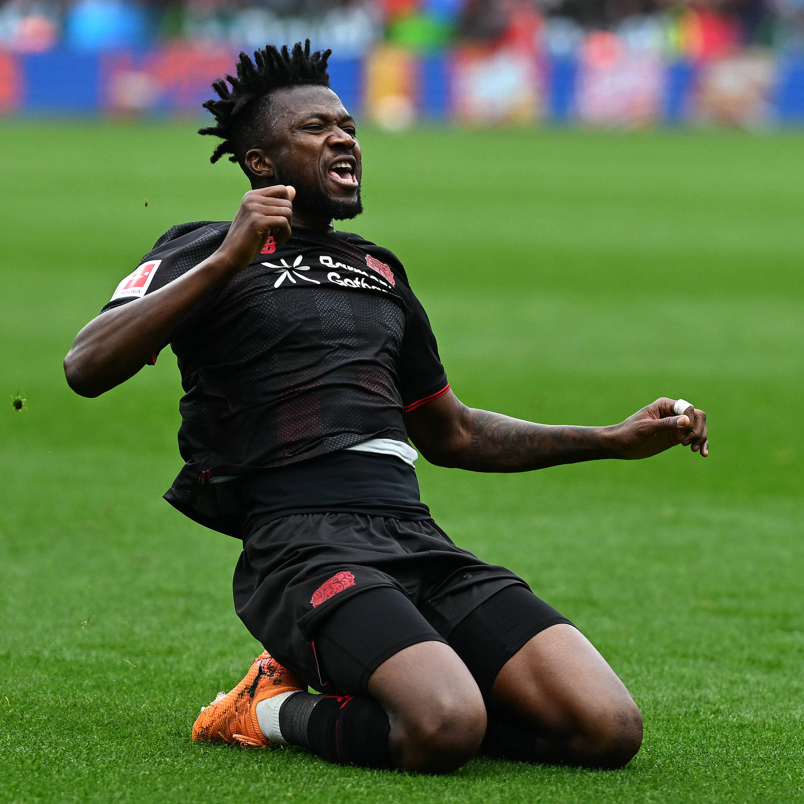 เมื่อวันที่ 4 เมษายน ผู้เล่น Leverkusen Tapsoba ได้ฉลองประตู สำนักข่าวซินหัว (ภาพโดย Ulrich Hufnagher)