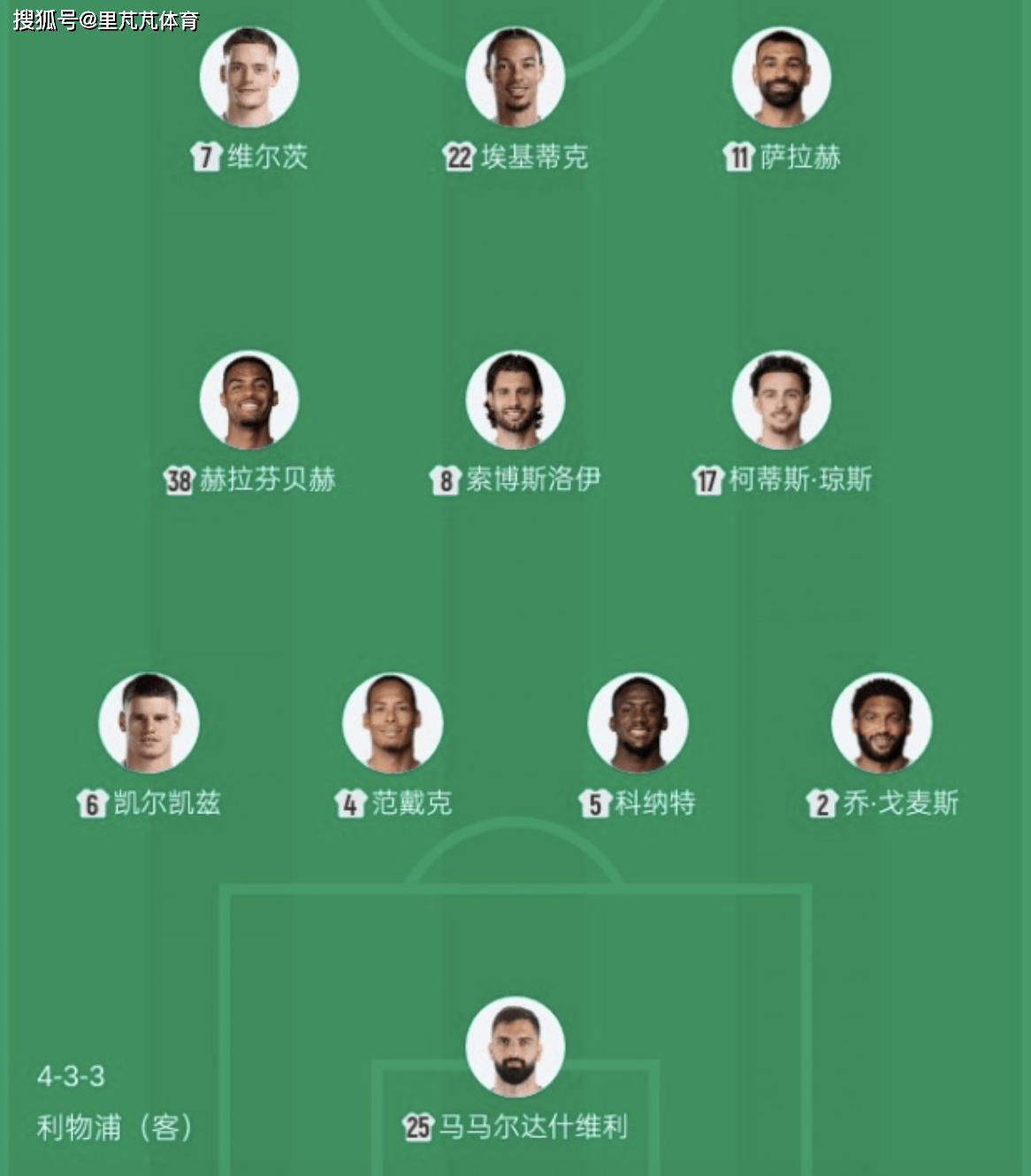 Liverpool เริ่มต้น: 25-Mamaldashvili, 2-Gomez, 4-Vandek, 5-Konat, 6-Kelkez, 7-Wilz, 8-Sobosloy, 17-Jones, 38-Haraffenbah, 11-Salah, 22-Ekitik