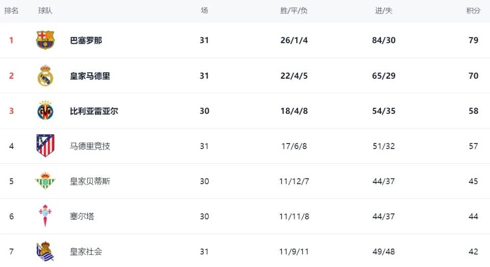 ในอันดับ บาร์เซโลนานำหน้าด้วยตัวชี้ 79 ตัว และโอกาสที่จะคว้าแชมป์ได้นั้นสดใส เรอัล มาดริด รั้งอันดับ 2 ด้วยคะแนน 70 แต้ม ตามหลัง บาร์เซโลน่า 9 แต้ม และความหวังในการพลิกแชมป์นั้นก็บางเบาอยู่แล้ว บีติสรั้งอันดับสามด้วยคะแนน 58 แต้ม แอตเลติโก มาดริด 4 ด้วย 57 แต้ม เรอัล เบติส อันดับที่ 5 ด้วยคะแนน 45 แต้ม เซลต้าอยู่ในอันดับที่ 6 ด้วยคะแนน 44 แต้ม เรอัล โซเซียโดอยู่ในอันดับที่เจ็ดด้วยคะแนน 42 แต้ม และเฮอร์ตาห์เฟย์อยู่ในอันดับที่แปดด้วยคะแนน 41 คะแนน