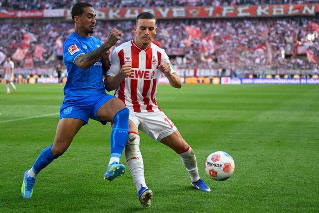 ↑ ผู้เล่นโคโลญจน์ (ขวา) และผู้เล่นเลเวอร์คูเซ่น อาร์เธอร์ ต่อสู้กันในเกม