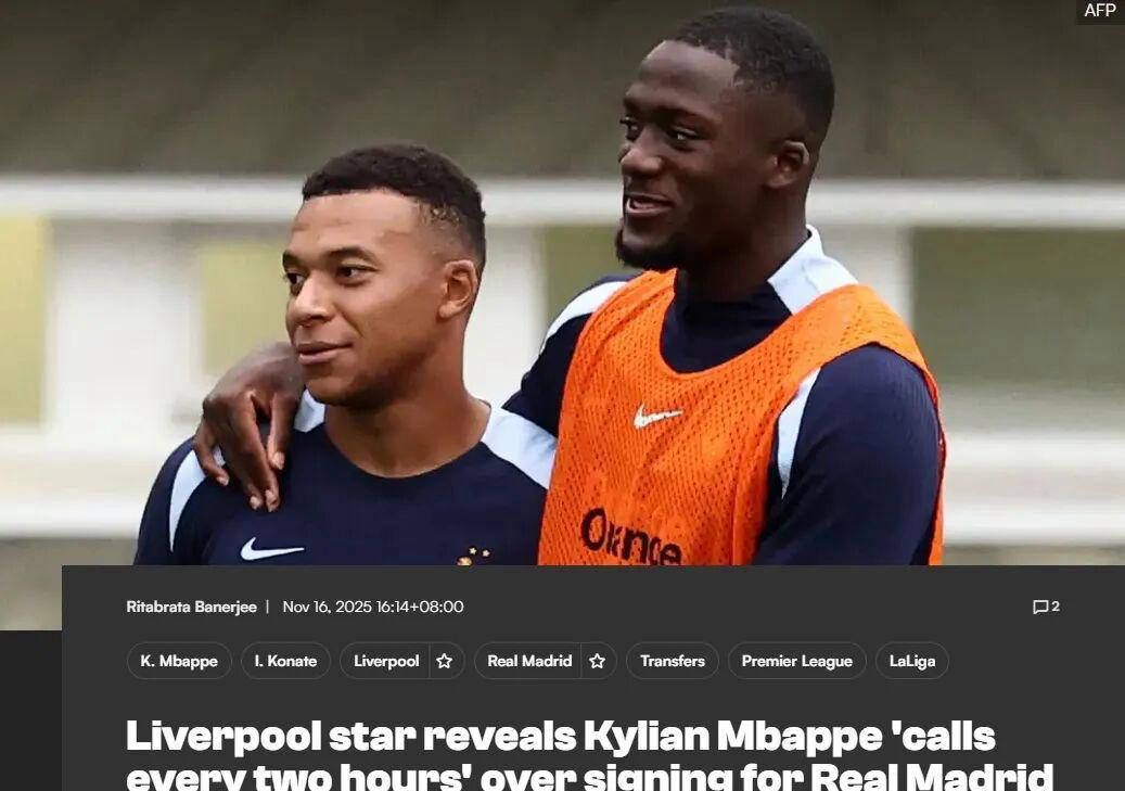 เมื่อเร็ว ๆ นี้ กองหลังของลิเวอร์พูล อิบราฮิมา โกนาเต้ เปิดเผยว่าเพื่อนร่วมทีมชาติของเขา คีเลียน เอ็มบัปเป้ ได้โทรศัพท์หาเขาเกือบทุกสองชั่วโมงเพื่อโน้มน้าวให้เขาพิจารณาเข้าร่วมทีมเรอัล มาดริด สัญญาของกองหลังตัวกลางกับลิเวอร์พูลจะหมดลงในช่วงซัมเมอร์หน้า ตามรายงานของ Bild เมื่อสัปดาห์ที่แล้ว บาเยิร์น มิวนิค ก็กำลังจับตาดูโกนาเต้เช่นกัน แต่ดูเหมือนว่าผู้เล่นได้บอกเป็นนัยว่าเรอัล มาดริดได้เริ่มวางแผนที่จะเซ็นสัญญากับเขาแล้ว