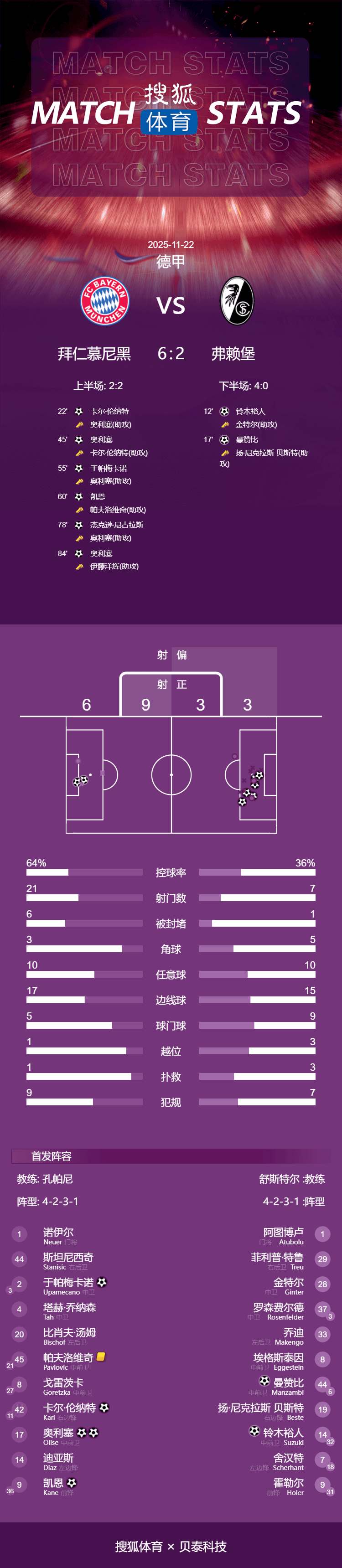 เวลา 22:30 น. ตามเวลาปักกิ่ง วันที่ 22 พฤศจิกายน การแข่งขันบุนเดสลีกา รอบที่ 11 ได้เริ่มขึ้น โดยบาเยิร์น มิวนิค เปิดบ้านต้อนรับการมาเยือนของไฟร์บวร์ก ไฟร์บวร์กใช้โอกาสจากลูกเตะมุมสองครั้งในนาทีที่ 12 และ 17 โดยยูโตะ ซูซูกิ และมันซัมบี ทำประตูติดต่อกันจากระยะใกล้ ในนาทีที่ 22 โอลิเช่ช่วยคาร์ลทำประตูตีตื้นด้วยลูกยิงเร็ว ในช่วงทดเวลาบาดเจ็บครึ่งแรก โอลิเช่ทำประตูตีเสมอได้ในนาทีที่ 54 อูปาเมกาโน่โหม่งลูกบอลเข้าประตูไปอย่างสวยงาม แฮร์รี เคนทำประตูเพิ่มอีกหนึ่งลูกด้วยการยิงระยะใกล้ในนาทีที่ 60 ในนาทีที่ 78 แจ็กสันทำประตูจากการสวนกลับอย่างรวดเร็วหลังจากได้รับการช่วยเหลือจากโอลิเซ่ โอลิเซ่ตัดเข้าในแล้วทำประตูในนาทีที่ 85 บาเยิร์นสามารถพลิกกลับมาชนะได้ 6-2 หลังจากตามหลังอยู่สองประตูเหนือไฟร์บวร์กหลังจากการแข่งขันรอบนี้ บาเยิร์นยังคงครองตำแหน่งจ่าฝูงอย่างมั่นคงด้วยคะแนน 31 แต้มจาก 11 นัด!