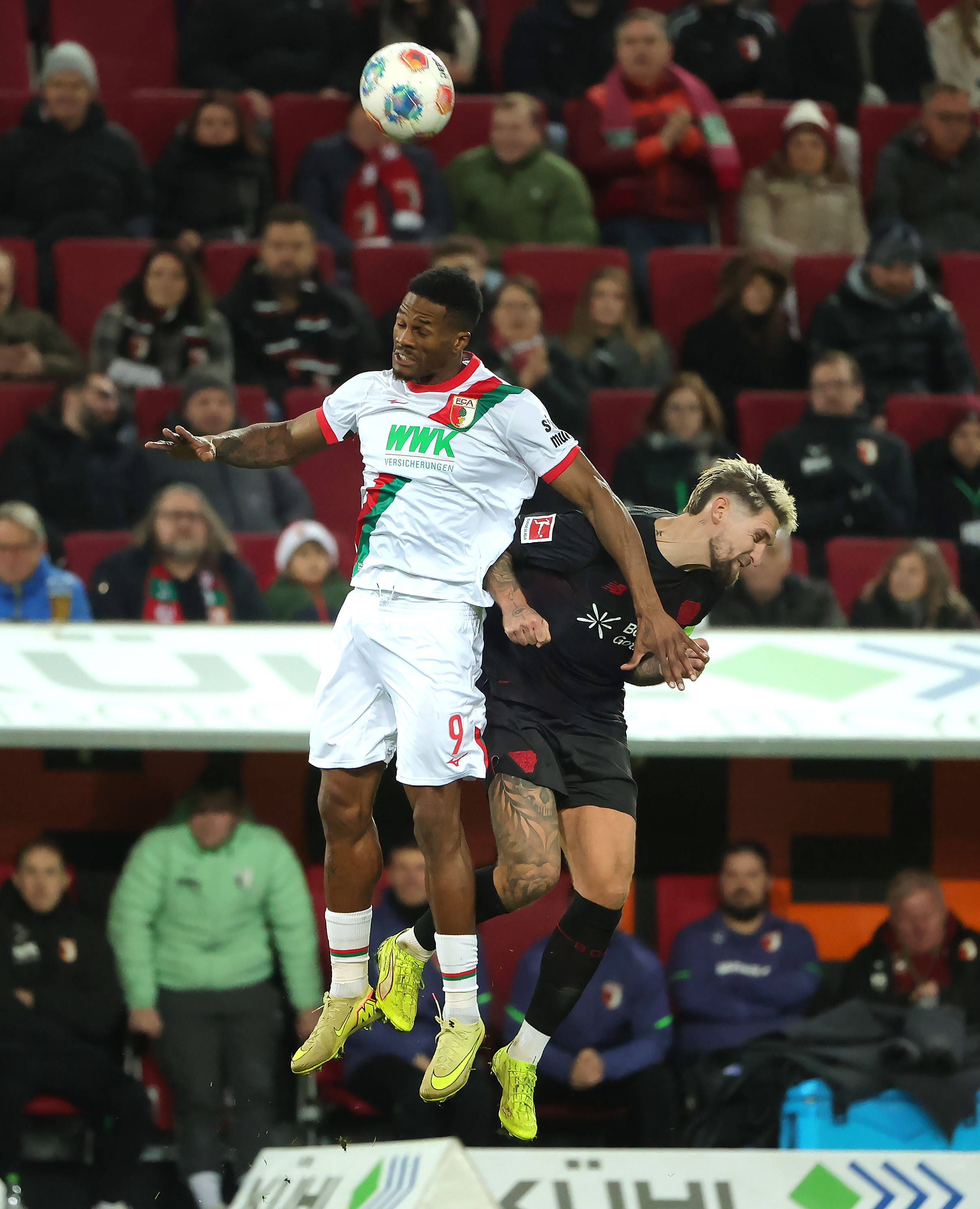 เมื่อวันที่ 6 กุมภาพันธ์ คาเดร (ซ้าย) ของเอาก์สบวร์ก และแทปโซบา ของไบเออร์ เลเวอร์คูเซ่น แย่งโหม่งลูกบอลระหว่างการแข่งขัน สำนักข่าวซินหัว (ภาพโดย ฟิลิปป์ รุยซ์)