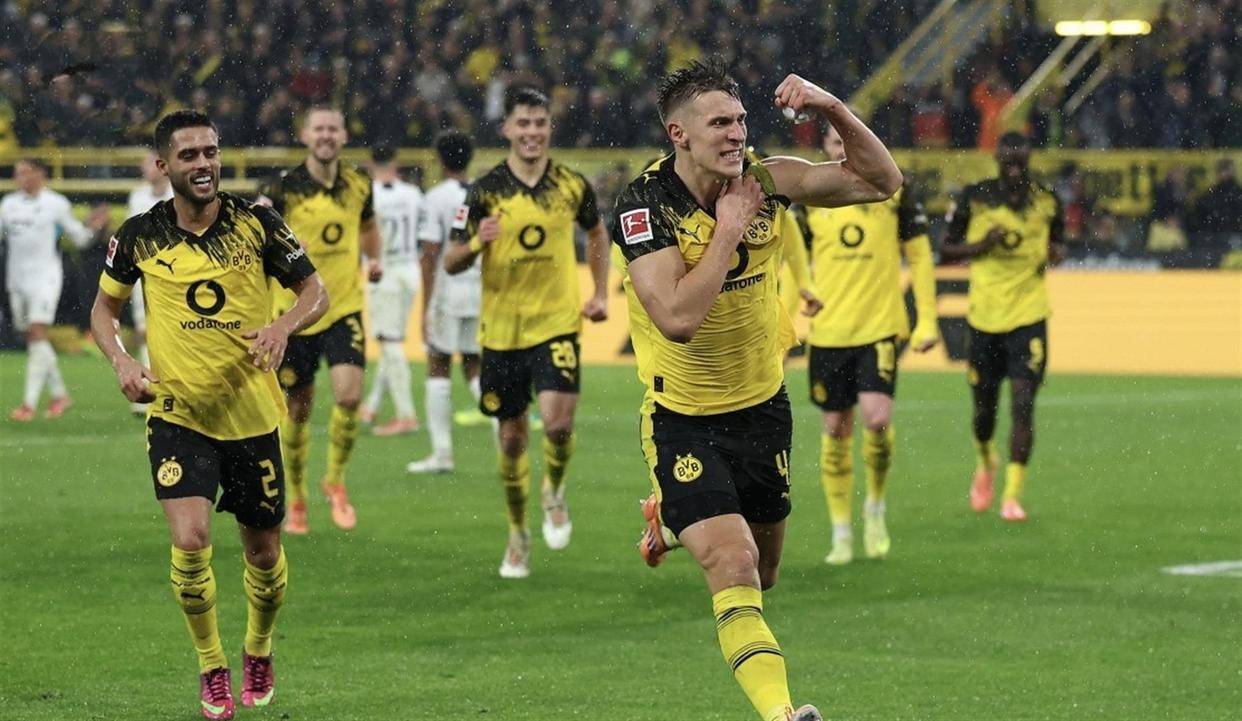 ในขณะเดียวกัน ในการแข่งขันบุนเดสลีกาคู่ขนาน โบรุสเซีย ดอร์ทมุนด์ คว้าชัยชนะตามตำราที่สนามซิกนัล อิดูนา พาร์ค คู่แข่งของพวกเขา โบรุสเซีย มึนเช่นกลัดบัค แพ้ติดต่อกัน 12 นัดที่สนามเหย้าของดอร์ทมุนด์ ซึ่งเป็นความเสียเปรียบทางจิตวิทยาในตัวเอง ในนาทีที่ 10 นิกลาส ซูเล่ เปิดบอลไปให้จูเลียน แบรดท์ ที่เสาไกล ซึ่งรับบอลด้วยการวอลเลย์อย่างยอดเยี่ยม ทำให้ดอร์ทมุนด์ขึ้นนำตั้งแต่ต้นเกม การเริ่มต้นที่สมบูรณ์แบบนี้ทำให้ทีมเสือเหลืองสามารถครองเกมได้อย่างสมบูรณ์