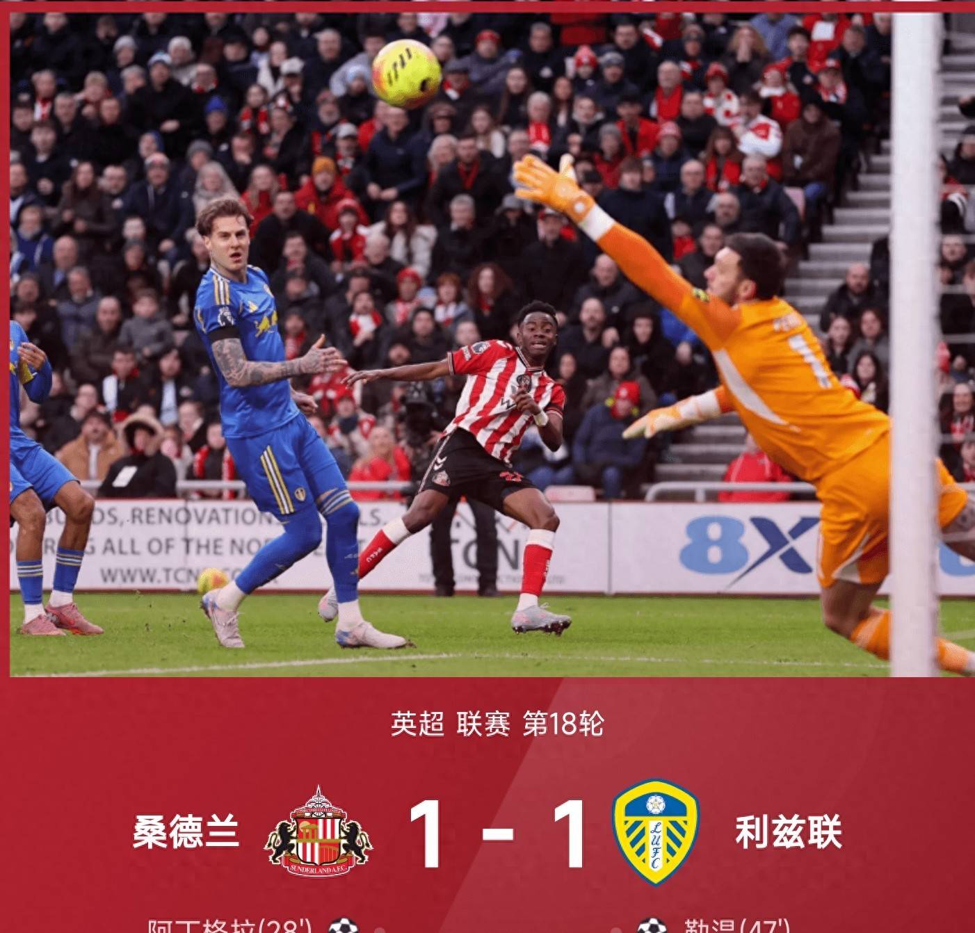 ซันเดอร์แลนด์ทำผลงานได้ค่อนข้างดีในฤดูกาลนี้ โดยรั้งอันดับที่เจ็ดในตาราง แต่เกมรุกของพวกเขาแย่มากในช่วงหลัง ในเกมเหย้านัดนี้กับลีดส์ ยูไนเต็ด อเดนกราทำประตูเบิกร่องด้วยการยิงโค้งจากมุมแคบในครึ่งแรก อย่างไรก็ตาม ลีดส์ตีเสมอได้เกือบจะทันทีหลังจากเริ่มครึ่งหลัง โดยอารอนสันจ่ายให้เลวินยิงเข้าไปง่ายๆ ทั้งสองฝ่ายมีโอกาสทำประตูหลังจากนั้น โดยโบเก้พลาดโอกาสยิงประตูโล่งๆ อย่างน่าเสียดายผู้รักษาประตูโรฟส์ก็มีบทบาทสำคัญเช่นกัน โดยเซฟลูกสำคัญหลายครั้งเพื่อช่วยให้การแข่งขันจบลงด้วยสกอร์ 1-1